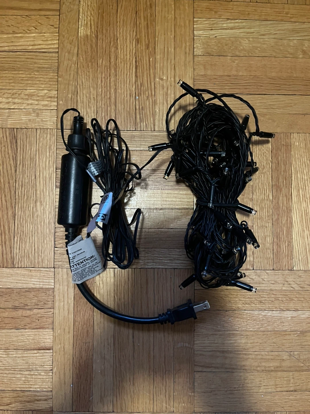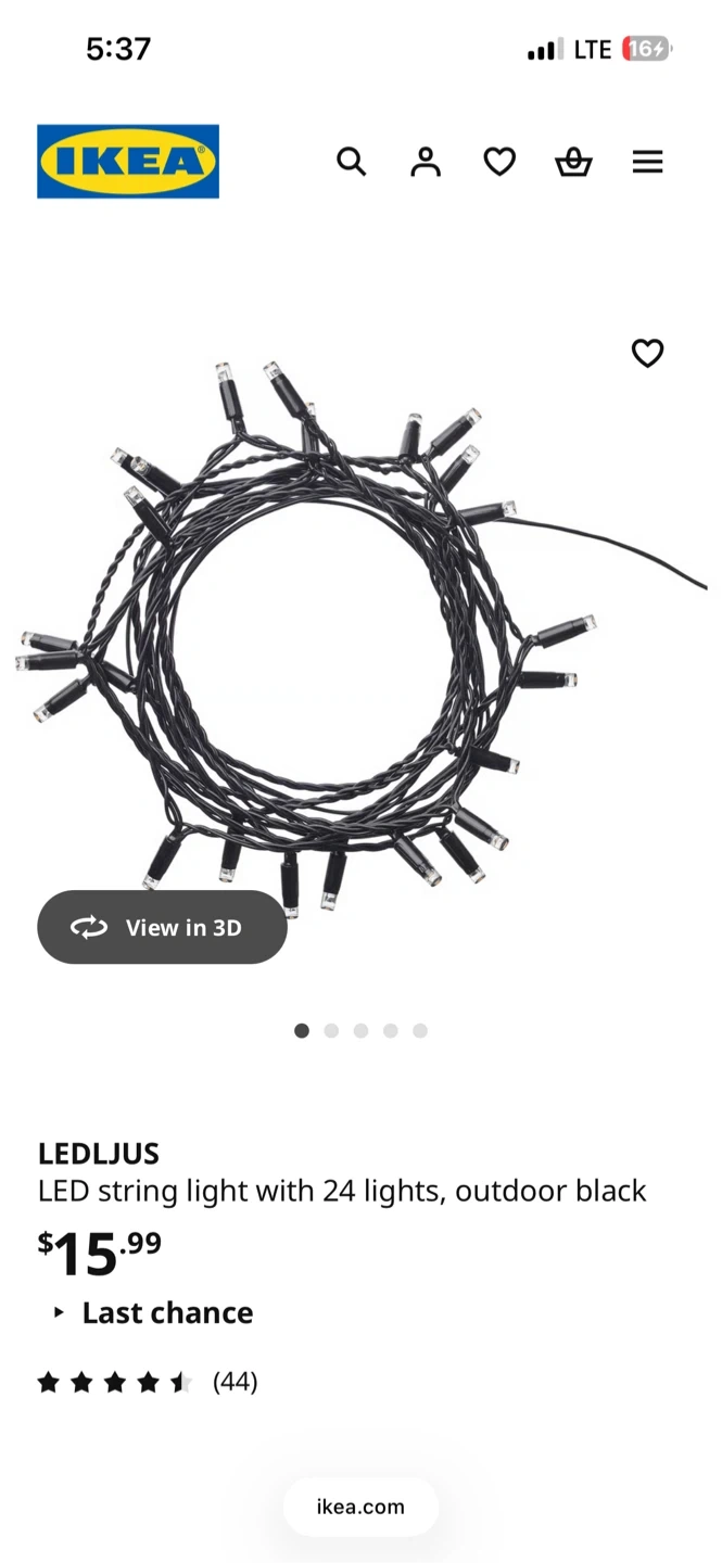 IKEA LEDLUS LED string light with 24 lights. This light string is black and suitable for outdoor use. It includes a power adapter.
