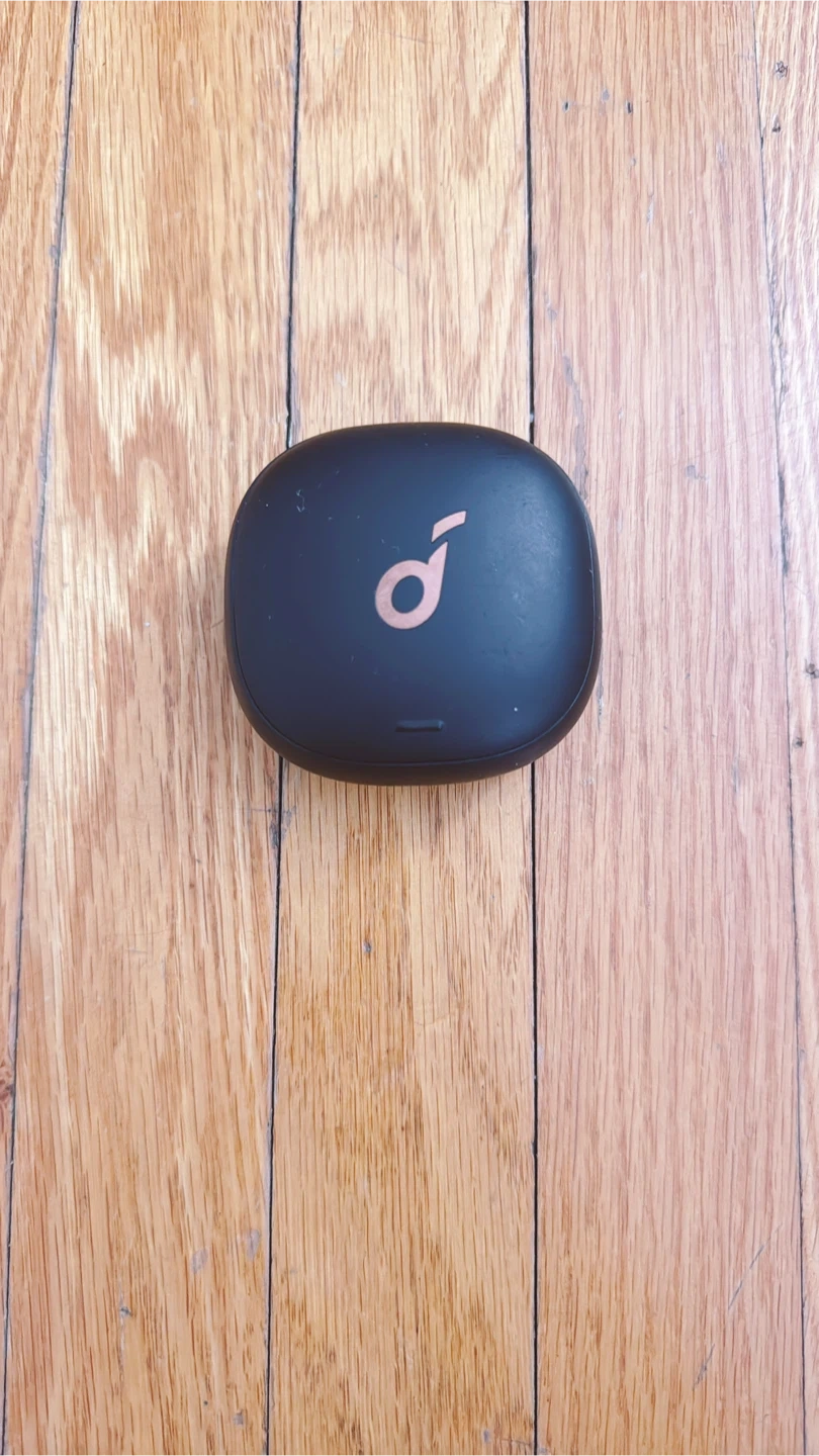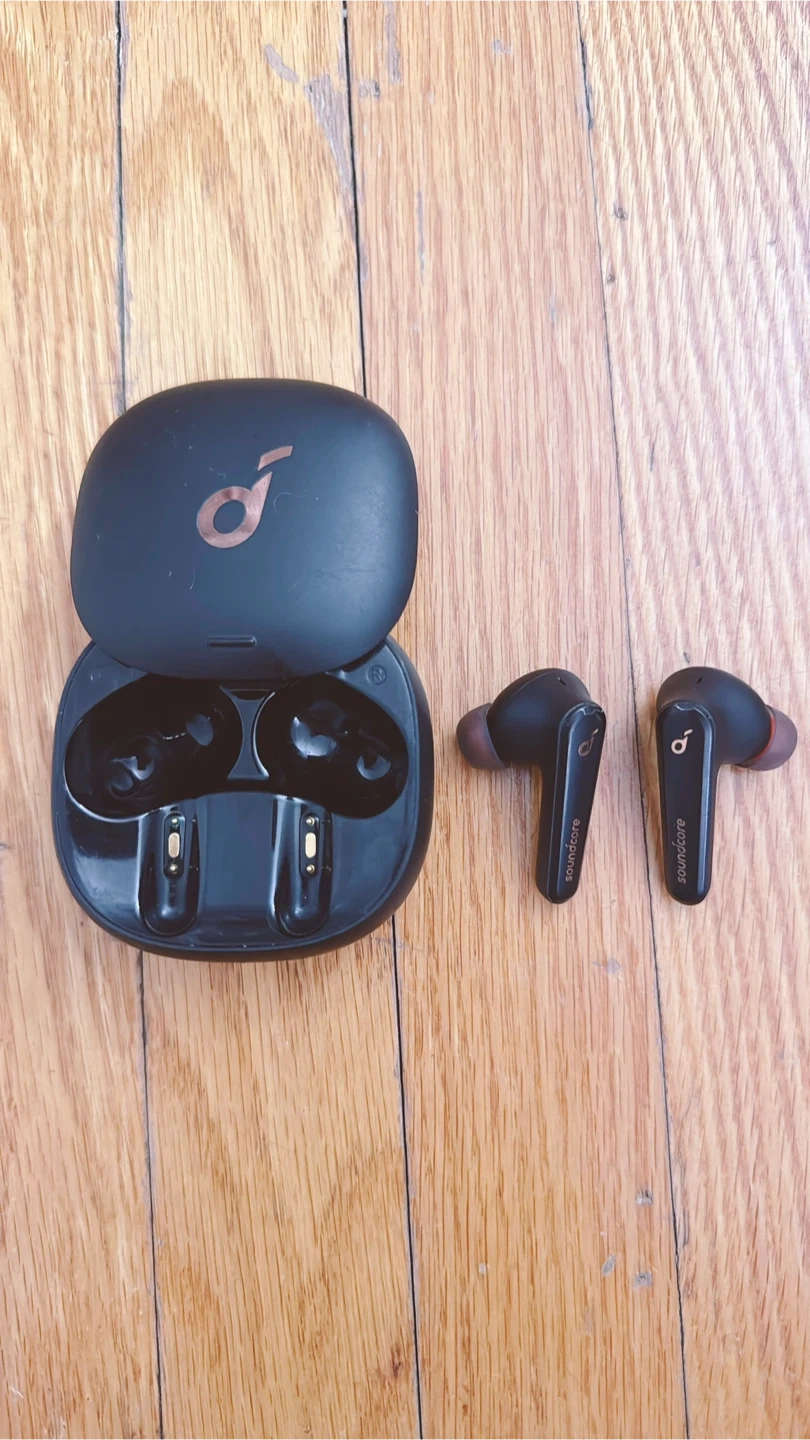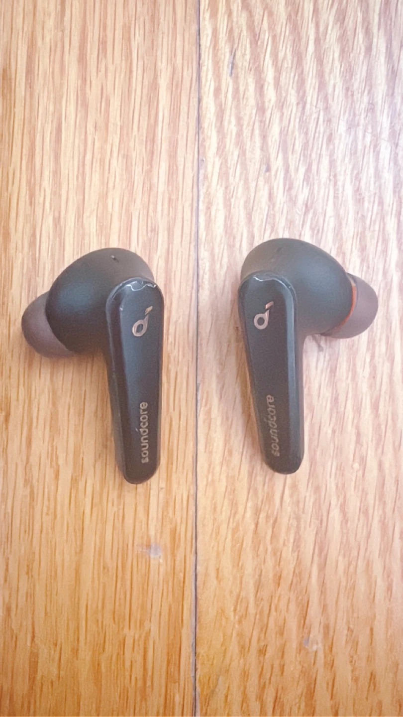 These are black earbuds featuring the Soundcore logo. Please note the following: