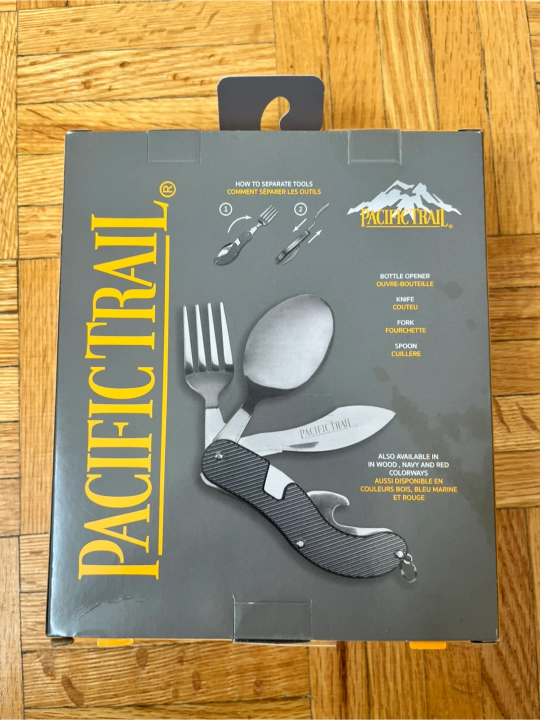This Pacific Trail camper multi-tool includes a knife, bottle opener, fork, and spoon. It's designed for quick deployment and convenient use. Great for camping and outdoor adventures!
