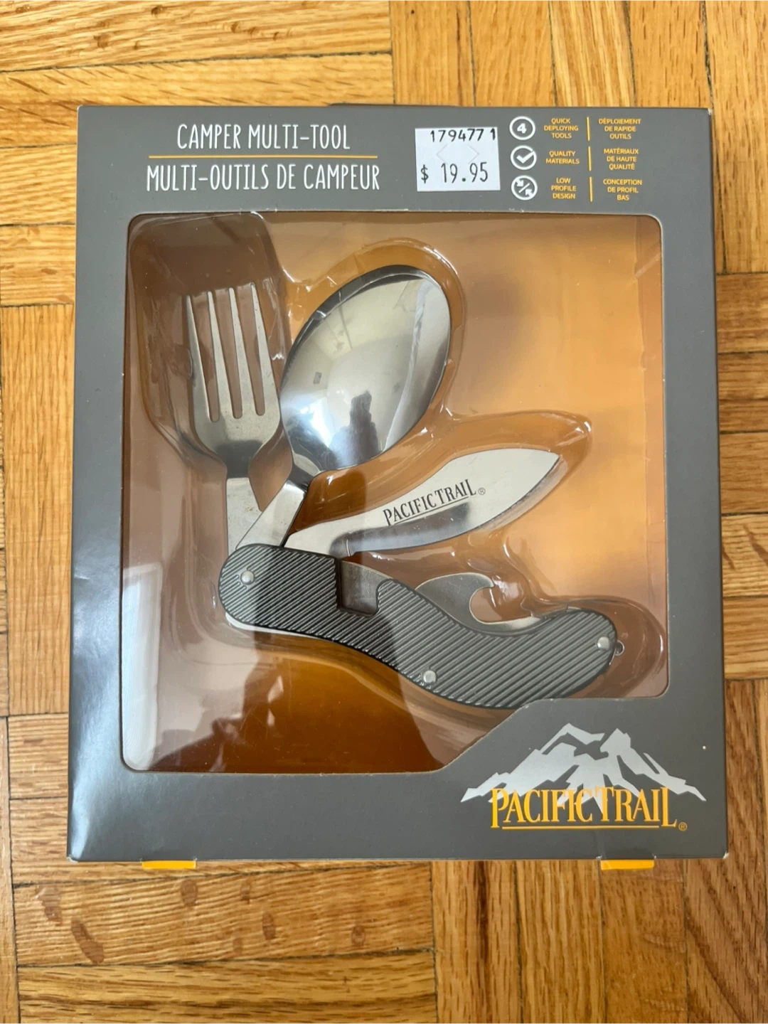 This Pacific Trail camper multi-tool includes a knife, bottle opener, fork, and spoon. It's designed for quick deployment and convenient use. Great for camping and outdoor adventures!