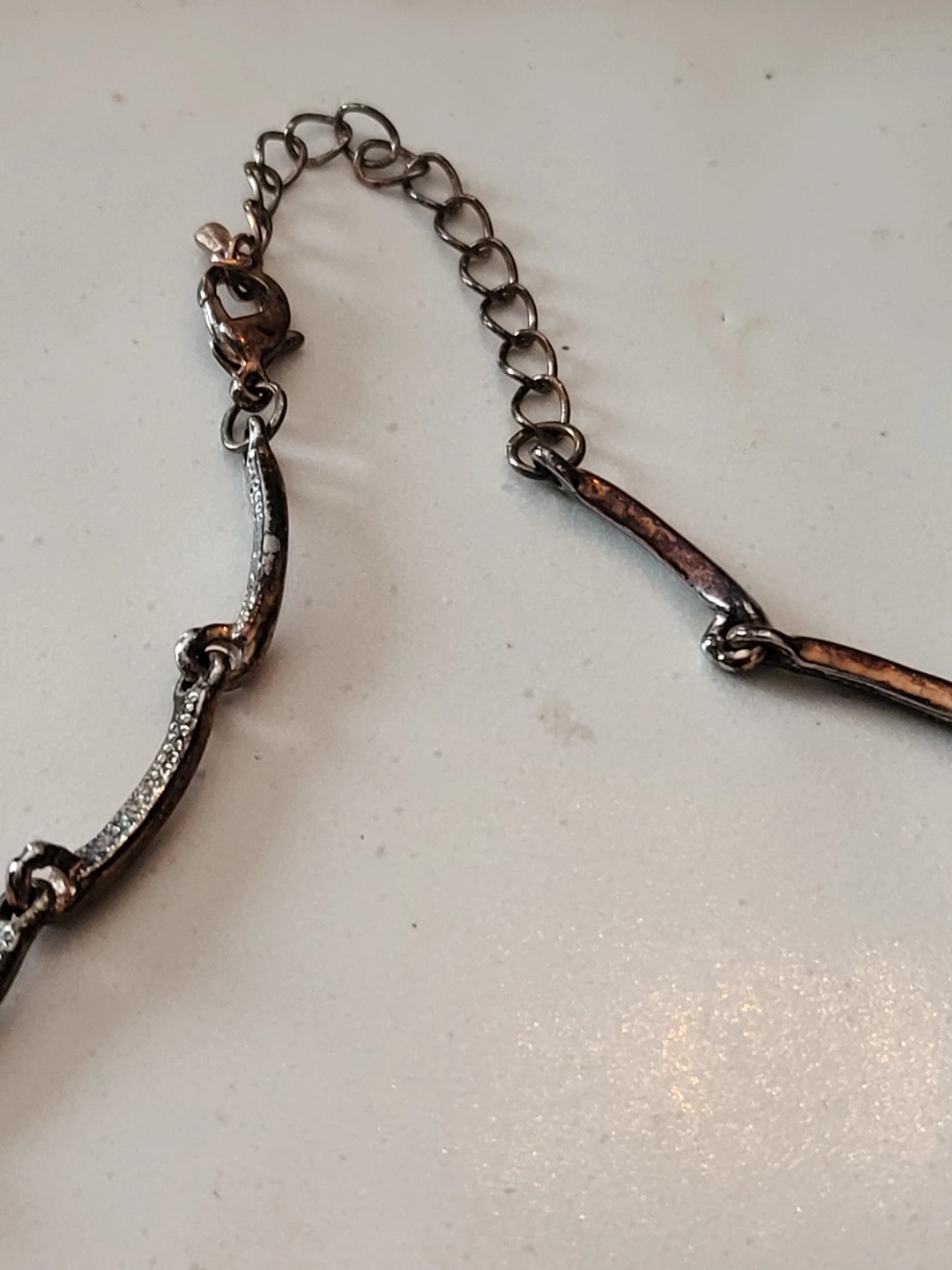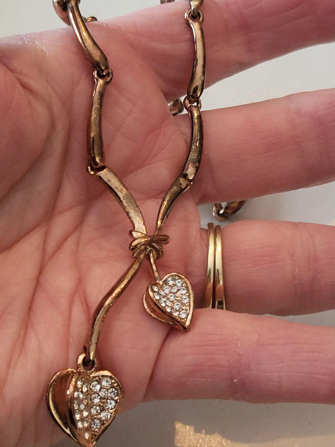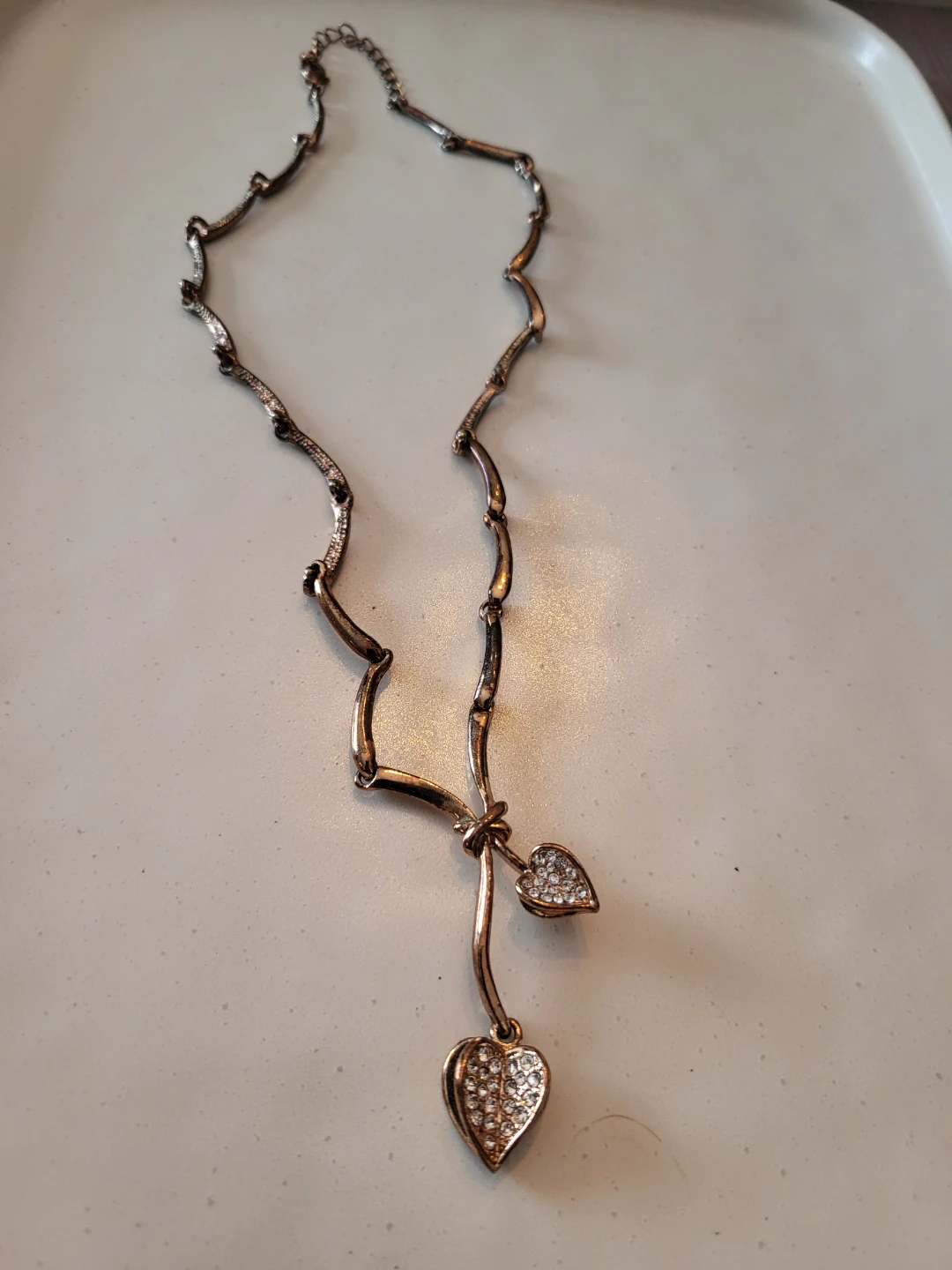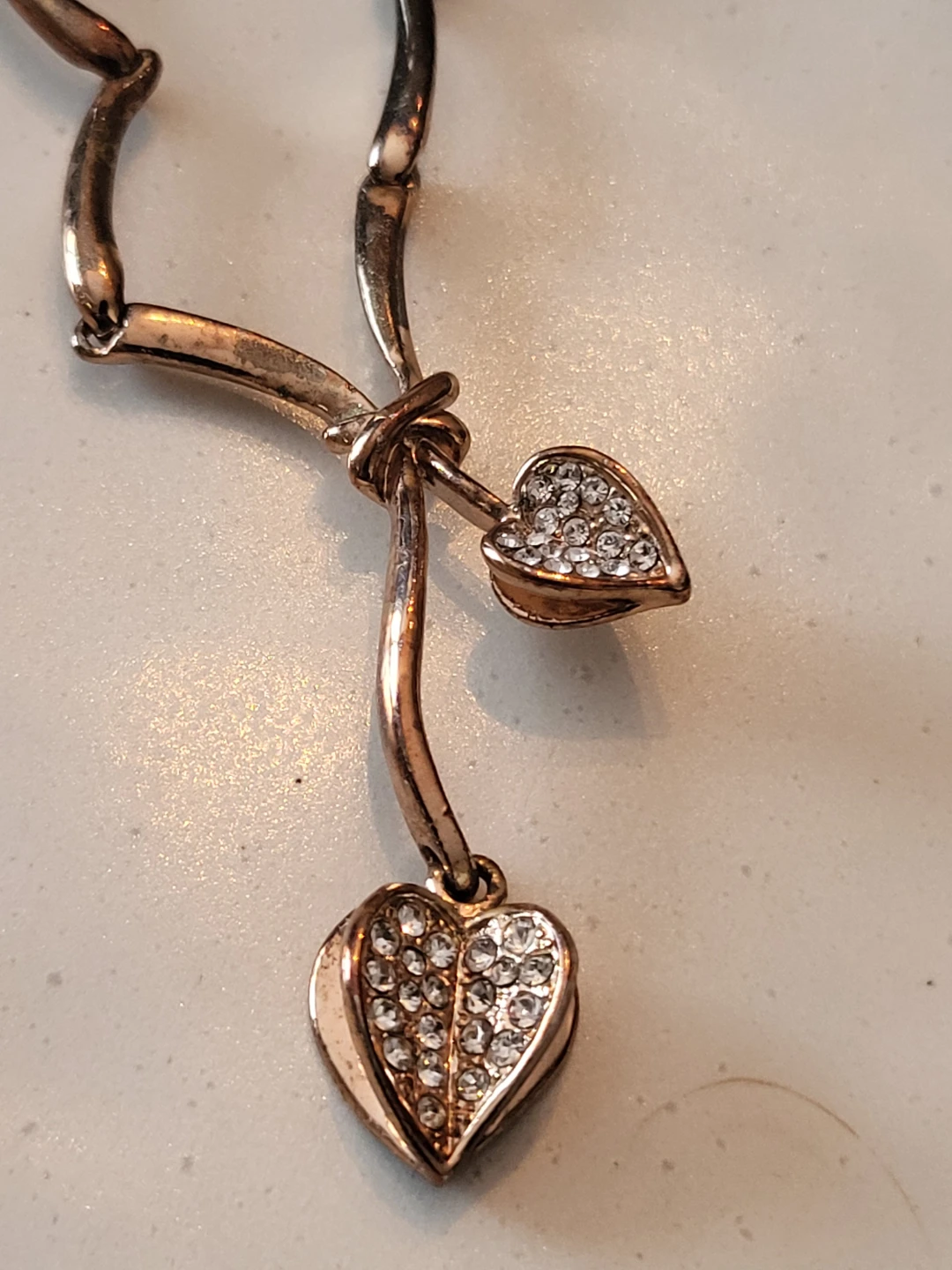 Here's a lovely heart pendant necklace! It features a bronze-coloured chain and two heart pendants adorned with rhinestones. It's in great condition and ready to add a touch of sparkle to your outfit