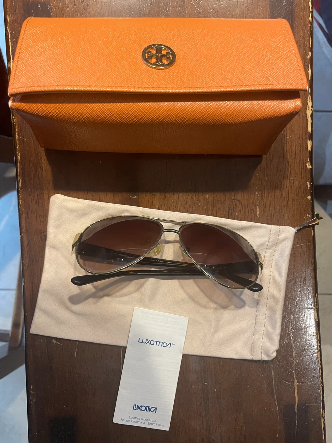 Classic Tory Burch sunglasses in a stylish aviator design. Comes with its original hard case and soft pouch for protection. Lens colour is a gradient brown.