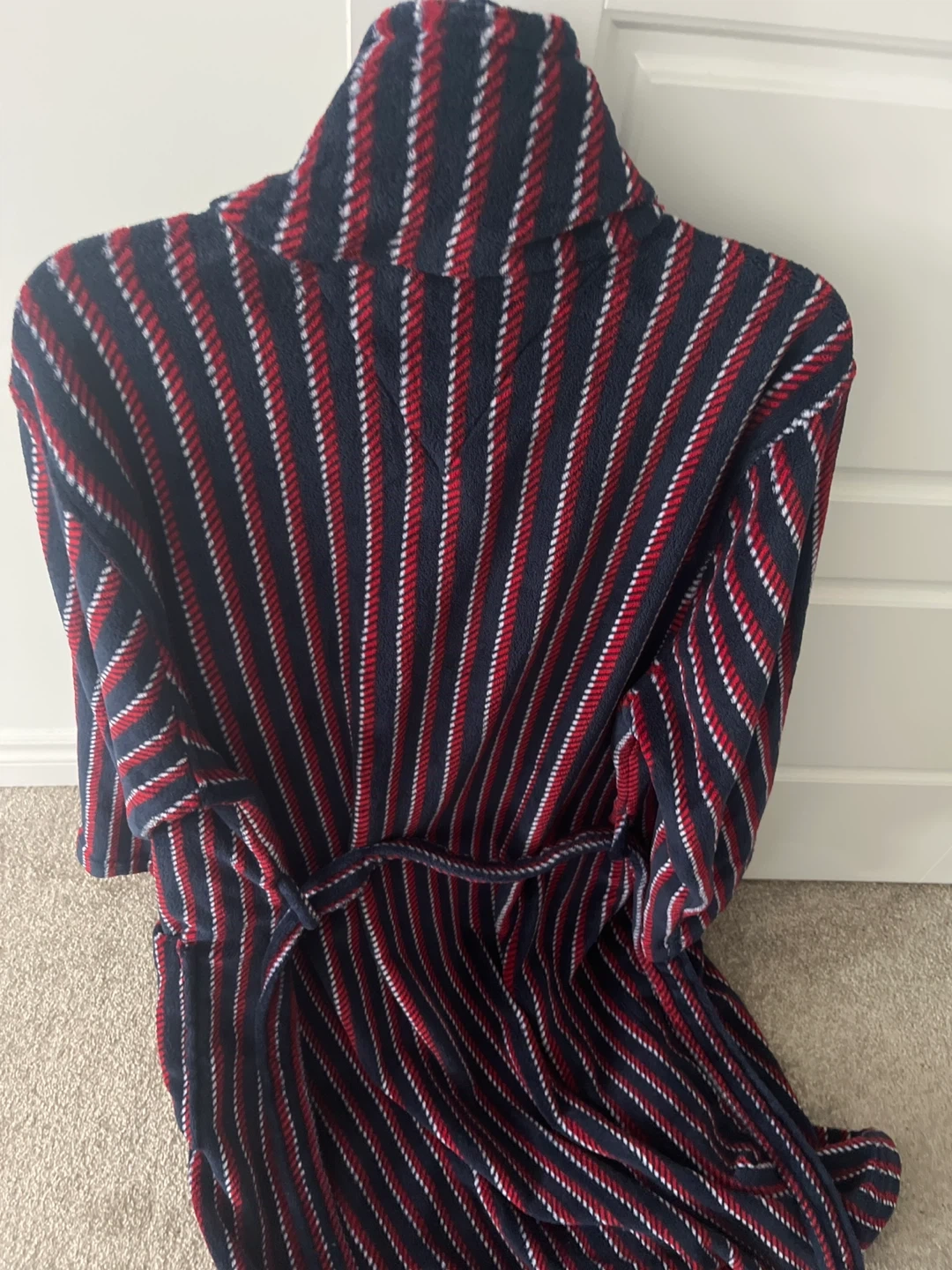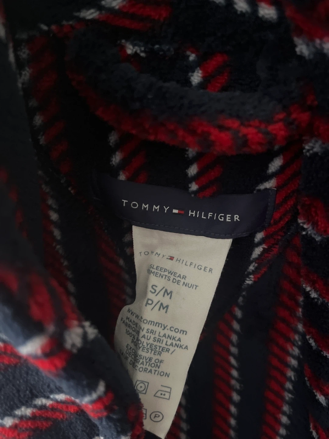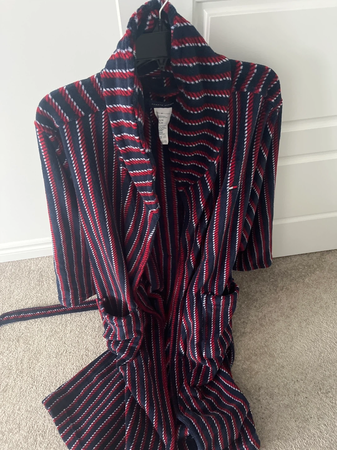 Cozy Tommy Hilfiger bathrobe in a red, white, and navy striped pattern! It's a size S/M and made of 100% polyester. Perfect for lounging around the house! Pet and smoke free home 🏠