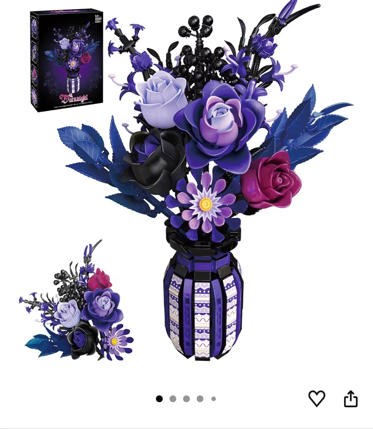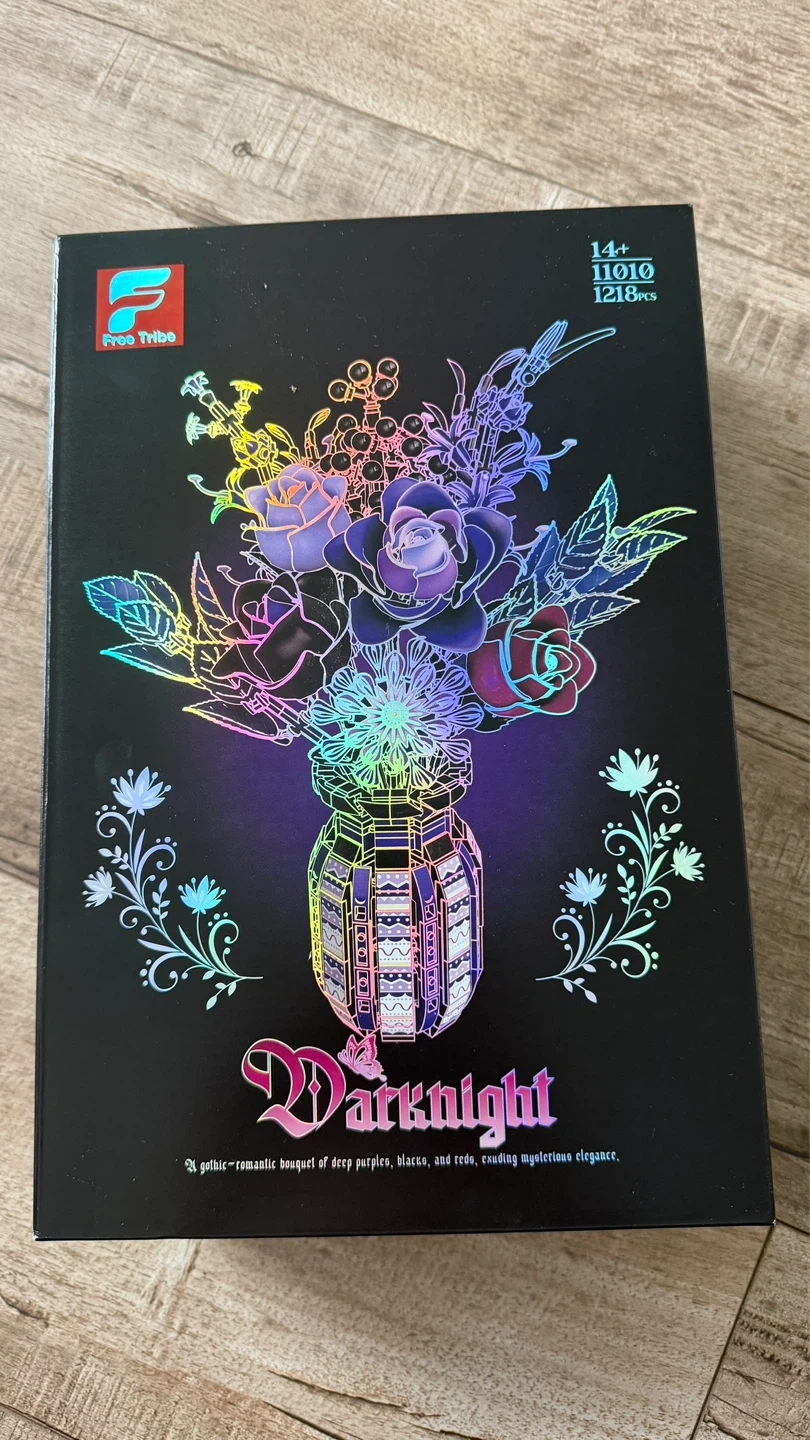Brand new, unopened Darknight. This building block set features a gothic-romantic bouquet of deep purples, blacks, and reds. It's inspired by roses and designed with intricate details. The set includes 1218 pieces.