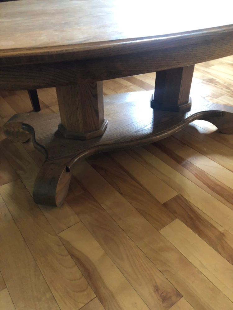 Oval coffee table with ornate legs. Made of wood. Oak but needs maybe some new stain also a couple of scratches on legs