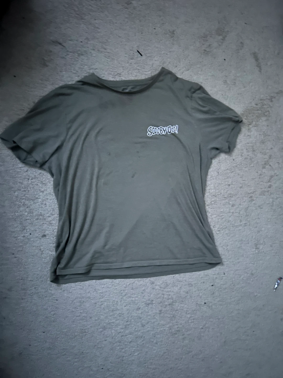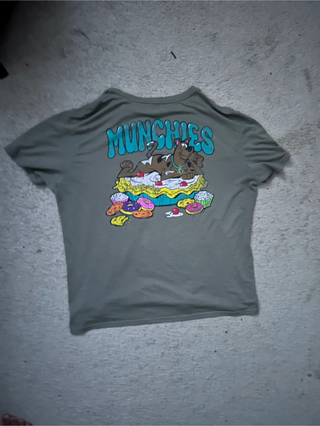 Olive green t-shirt with a Scooby-Doo "Munchies" graphic on the back. "Scooby-Doo" logo on the front. Cotton material.