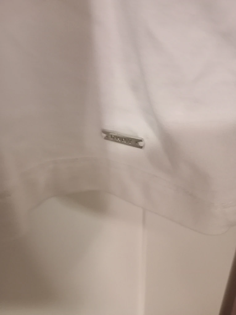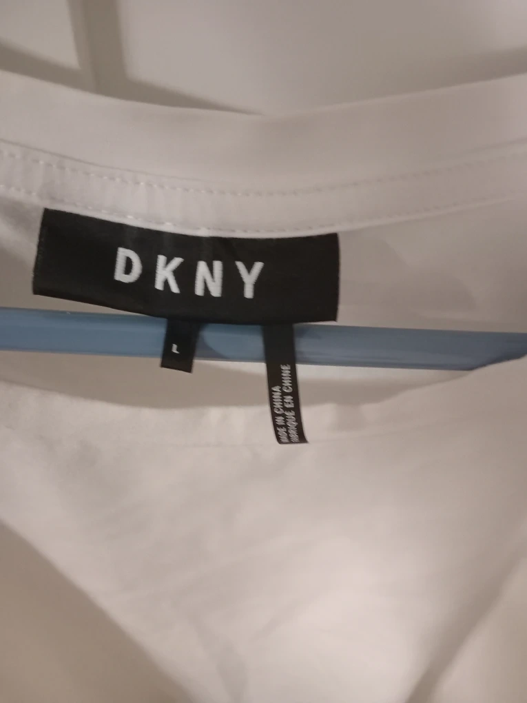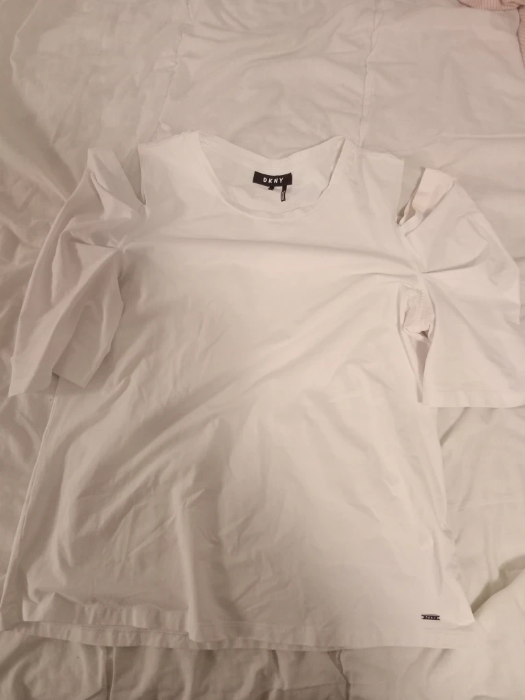 Here's a DKNY top in size large! It's white and features a cold shoulder design. Perfect for a casual look!