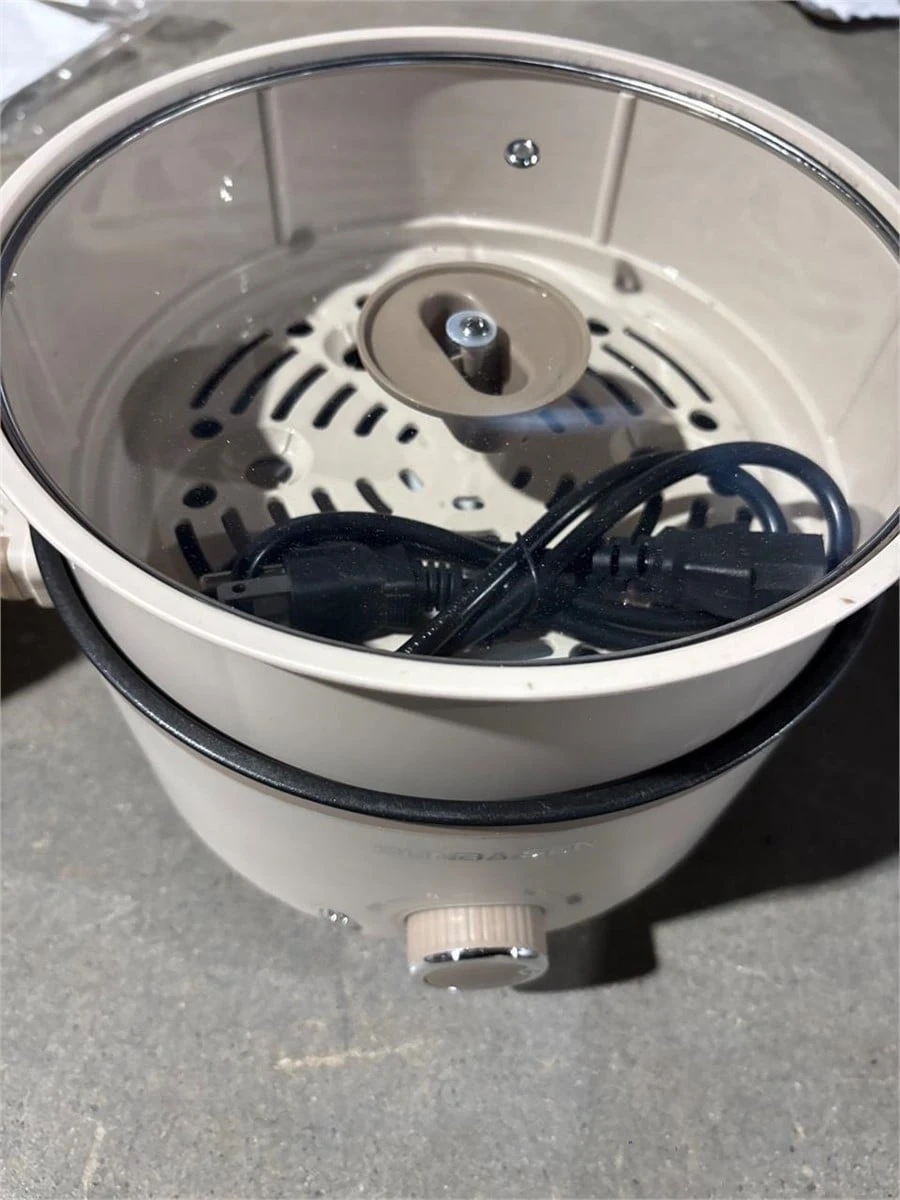 This electric steamer pot is perfect for cooking meals or steaming food. It features a non-stick interior and comes with a steamer basket and a glass lid. It's great for small kitchens or dorm rooms!