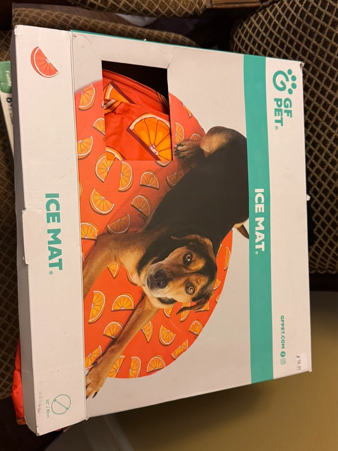 This is a GF PET ICE MAT, perfect for keeping your pet cool. It's 32 inches or 81 cm in size. This mat is great for warm days to provide comfort for your furry friend!