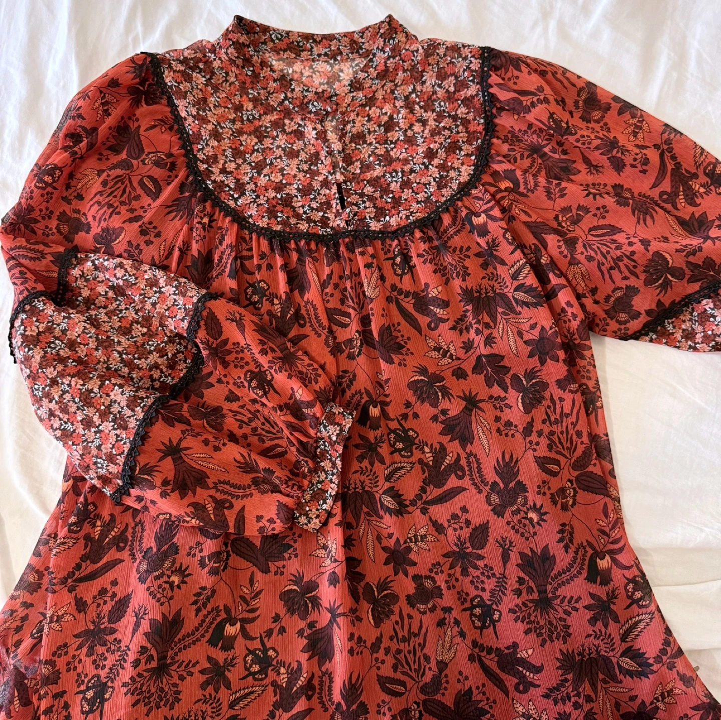 A stunning vintage long dress with a unique mix of floral prints and charming patchwork details. Featuring a relaxed fit, soft pleats, and sheer floral sleeves, this dress blends comfort and romantic style. The dress is fully lined, making it perfect for both daily wear and special occasions.