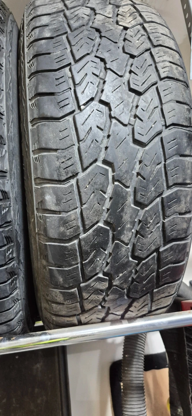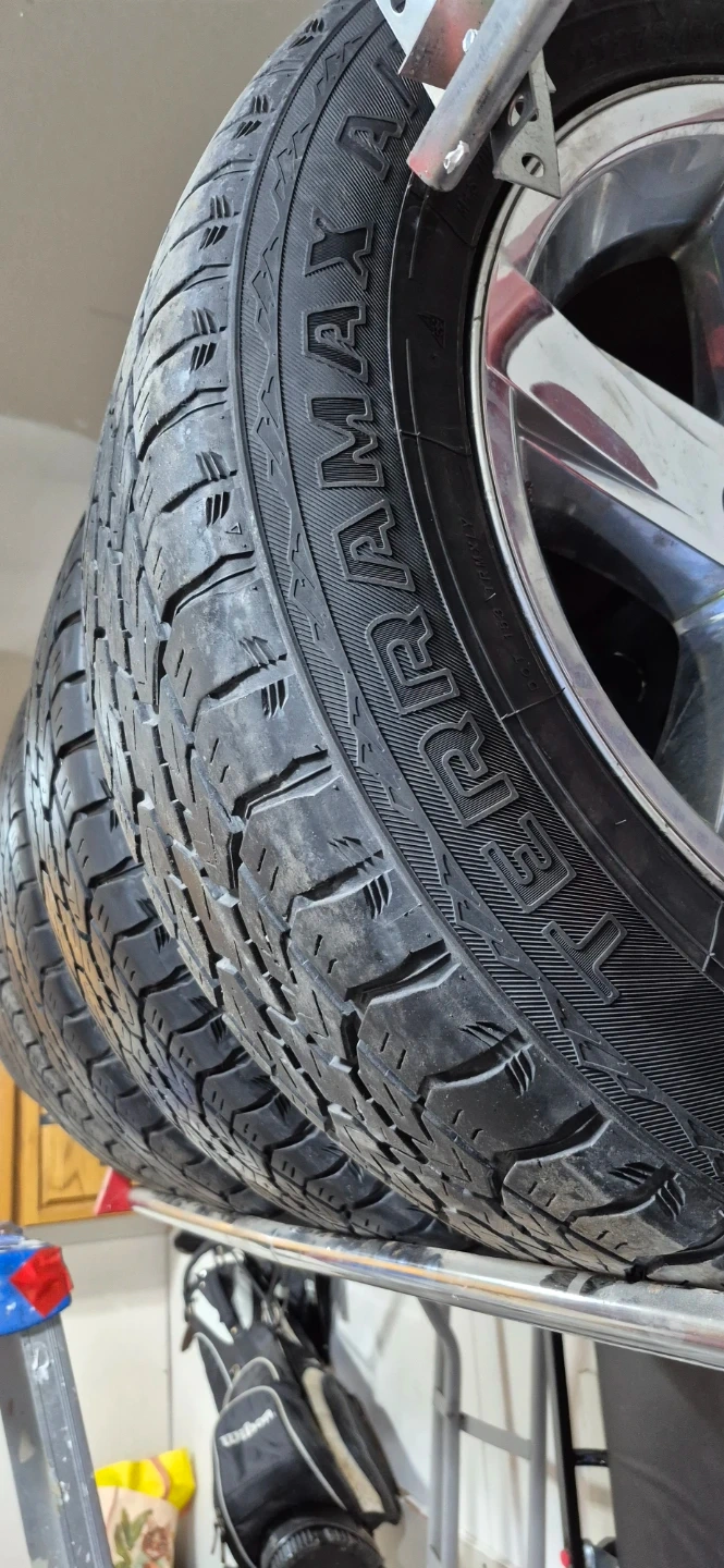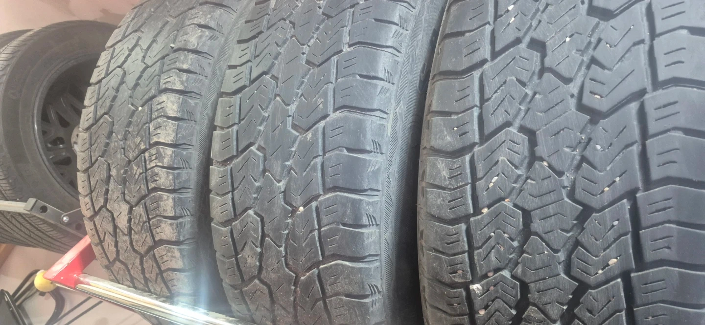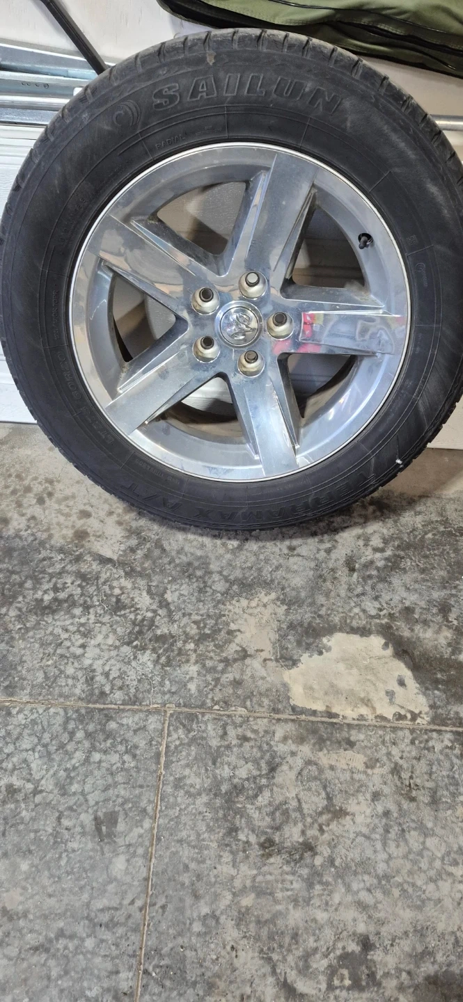 Four Sailun A T 10 ply tires mounted on Ram sport 20" rims. These tires are in good condition and ready for the road. The rims have a five-spoke design.