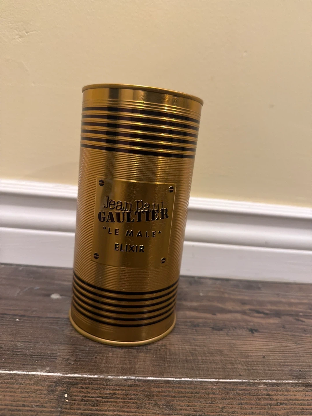 Jean Paul Gaultier "Le Male" Elixir Eau de Parfum in a striking gold bottle. It comes with its original cylindrical presentation case. This fragrance offers a rich and captivating scent experience.