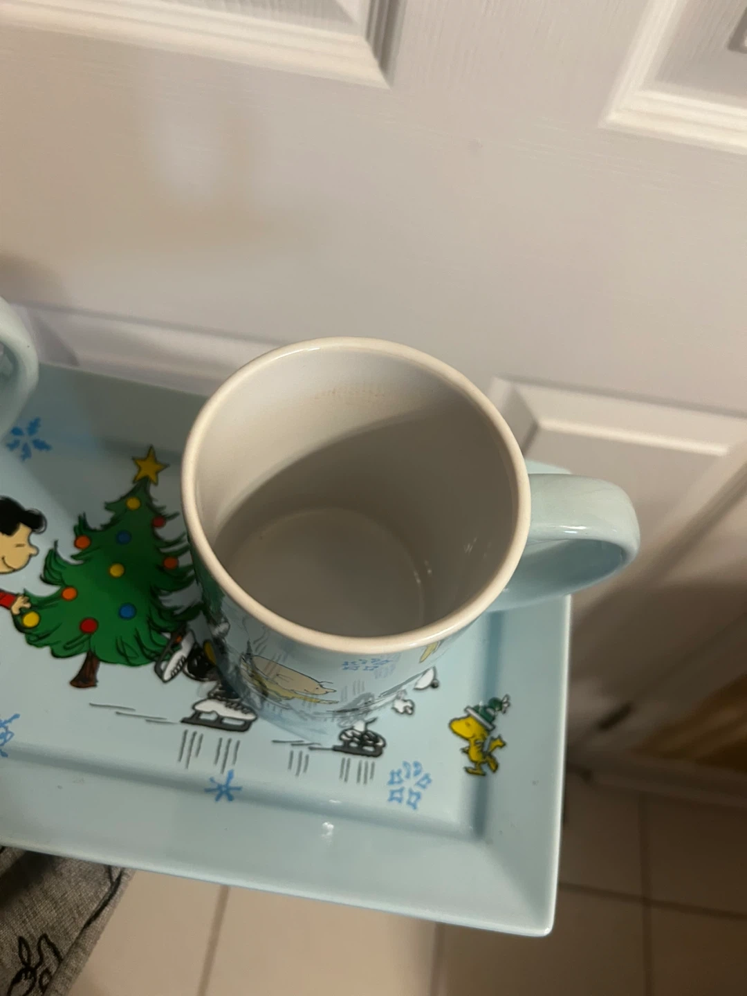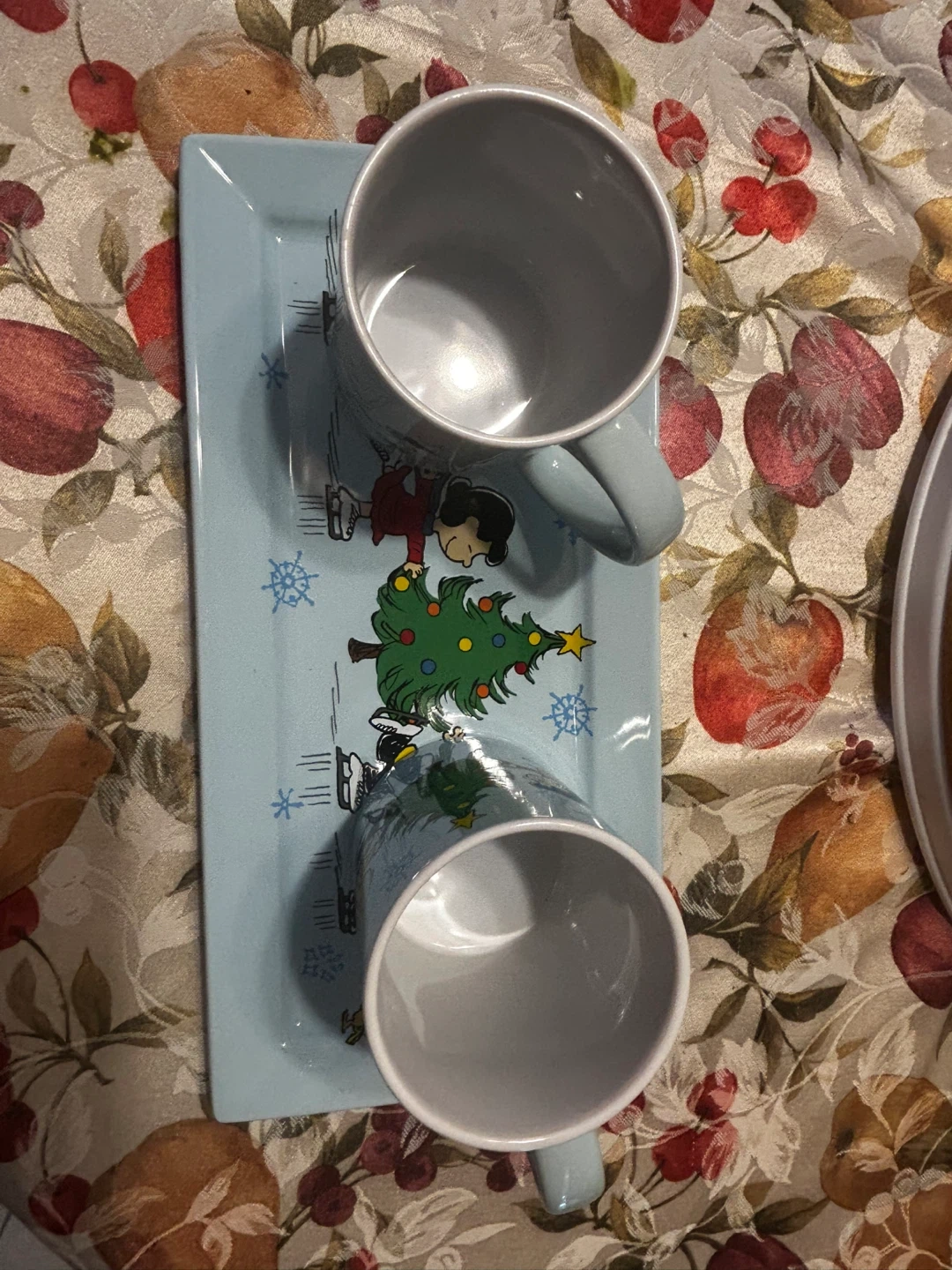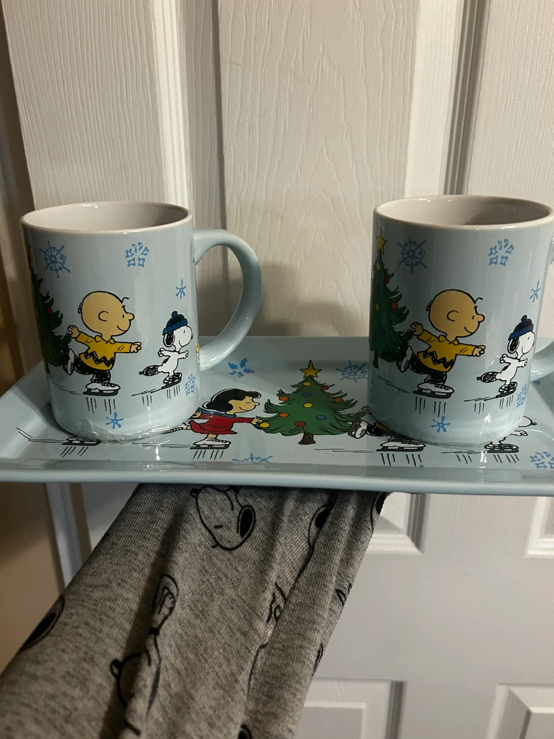 Selling a cute Peanuts Christmas themed mug and tray set! The set features Charlie Brown, Lucy, Snoopy and the Christmas tree on a light blue background. Perfect for the holidays!
