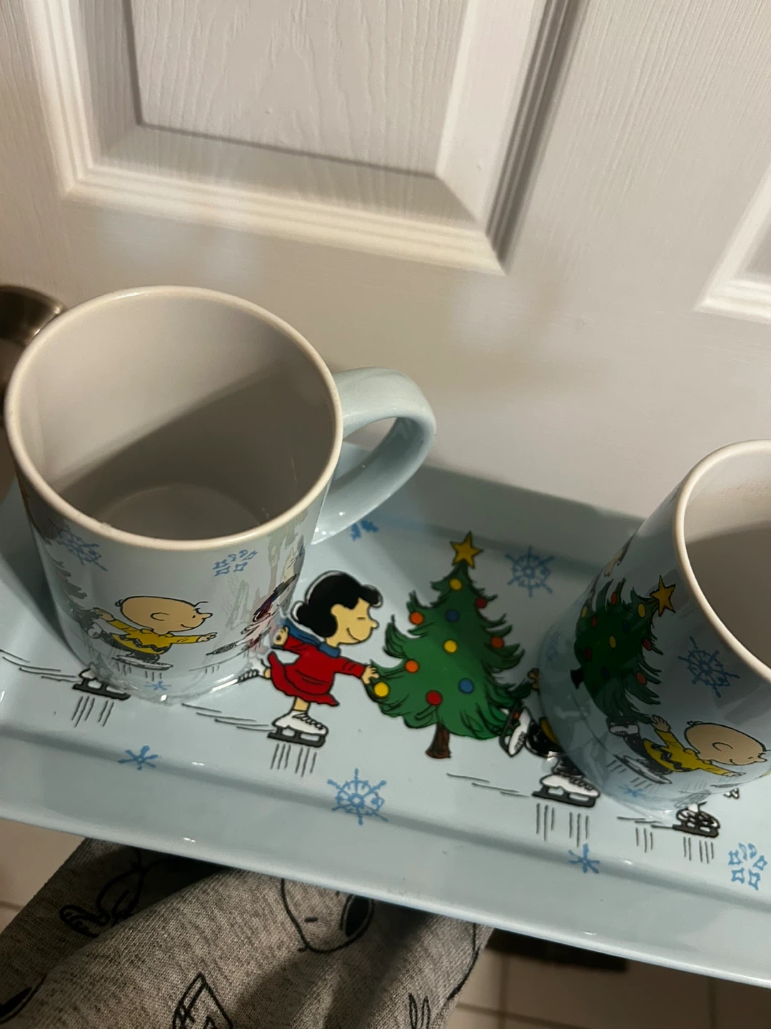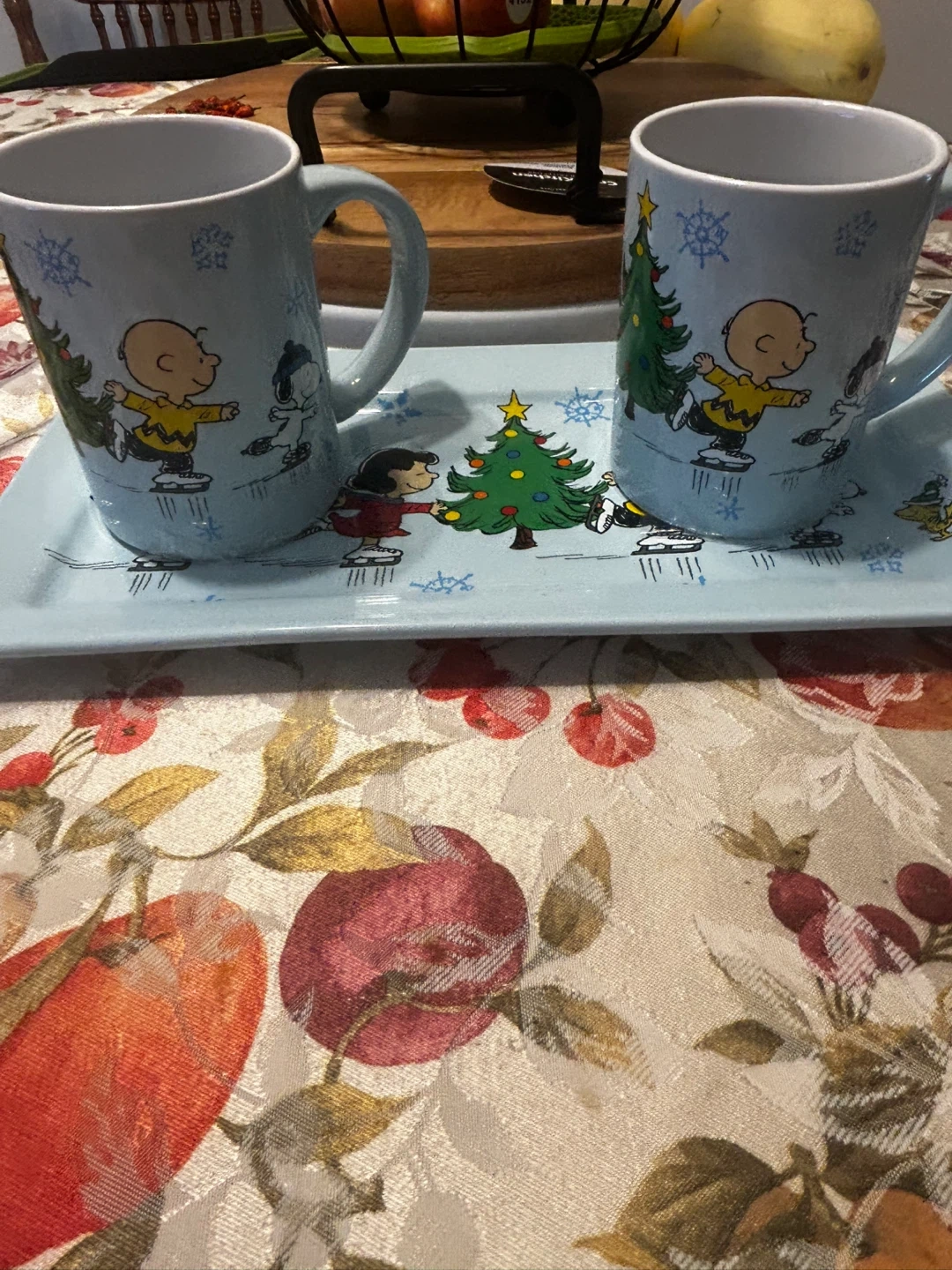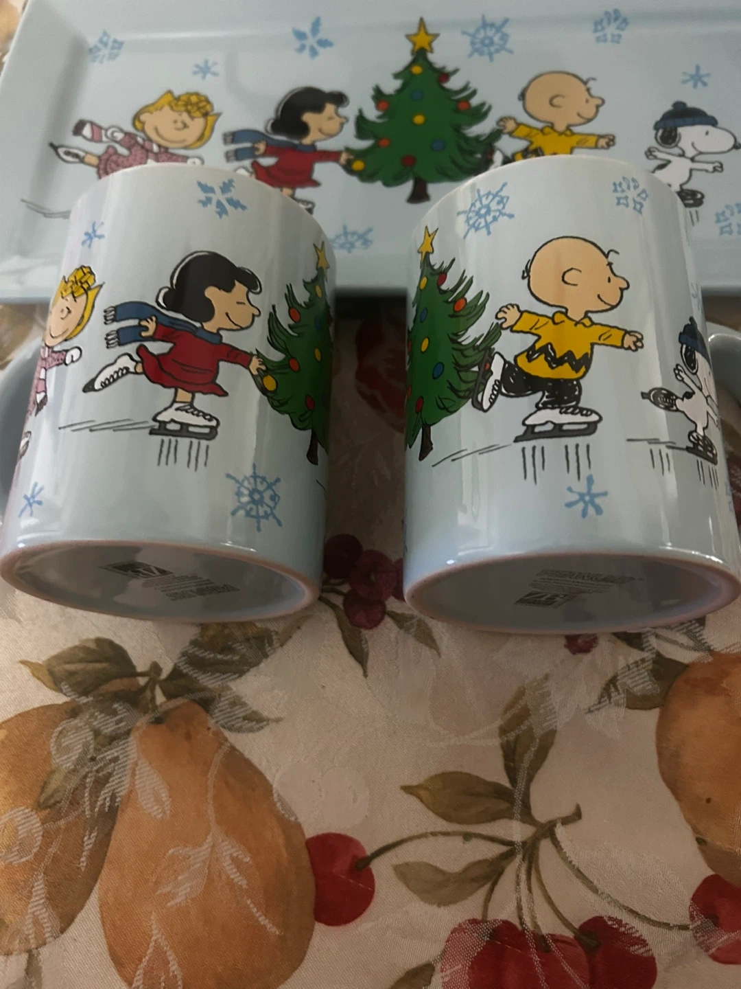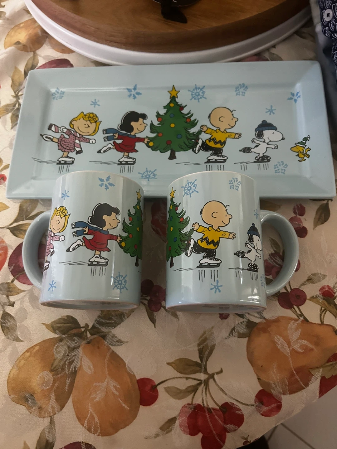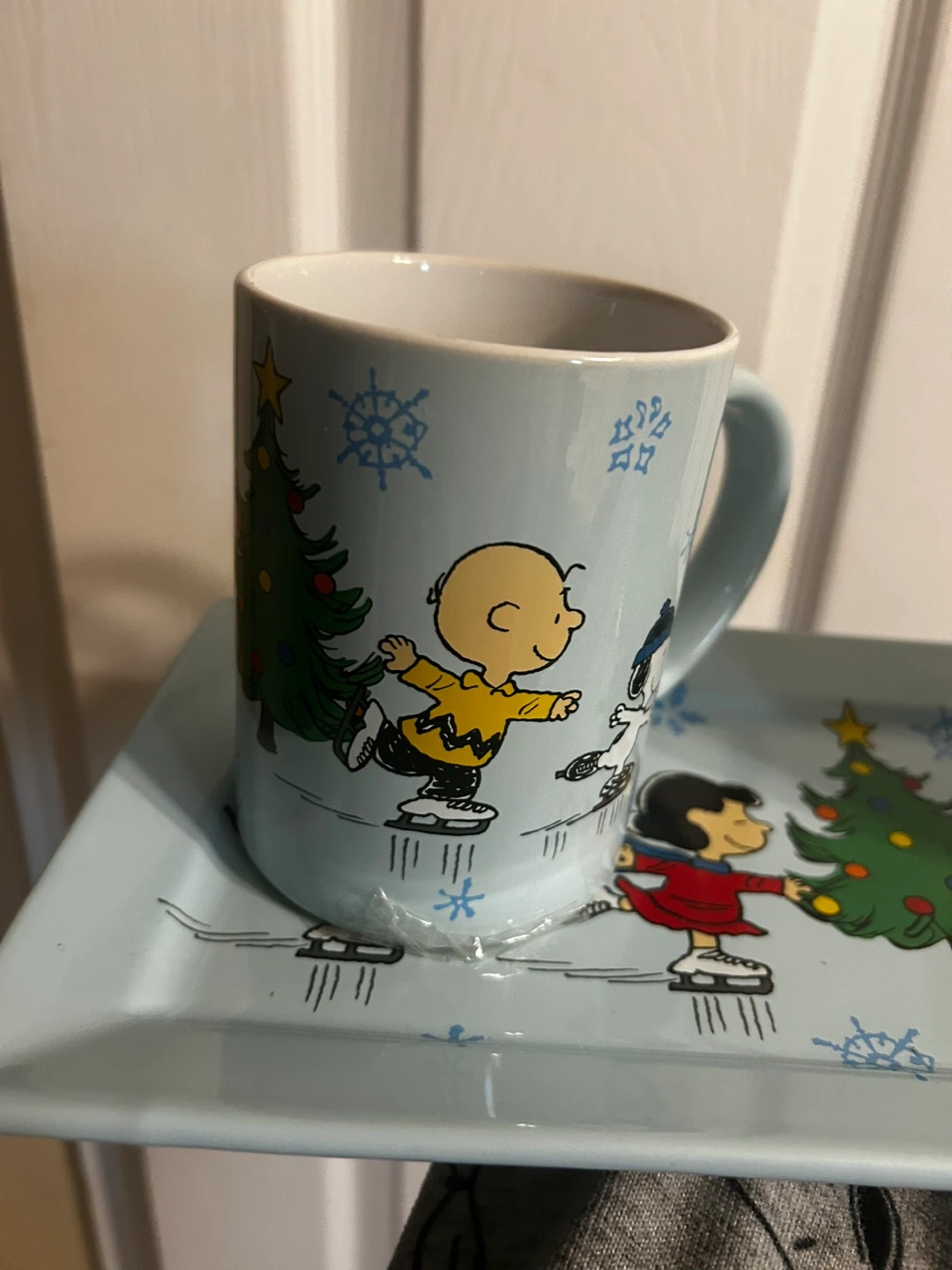 Selling a cute Peanuts Christmas themed mug and tray set! The set features Charlie Brown, Lucy, Snoopy and the Christmas tree on a light blue background. Perfect for the holidays!