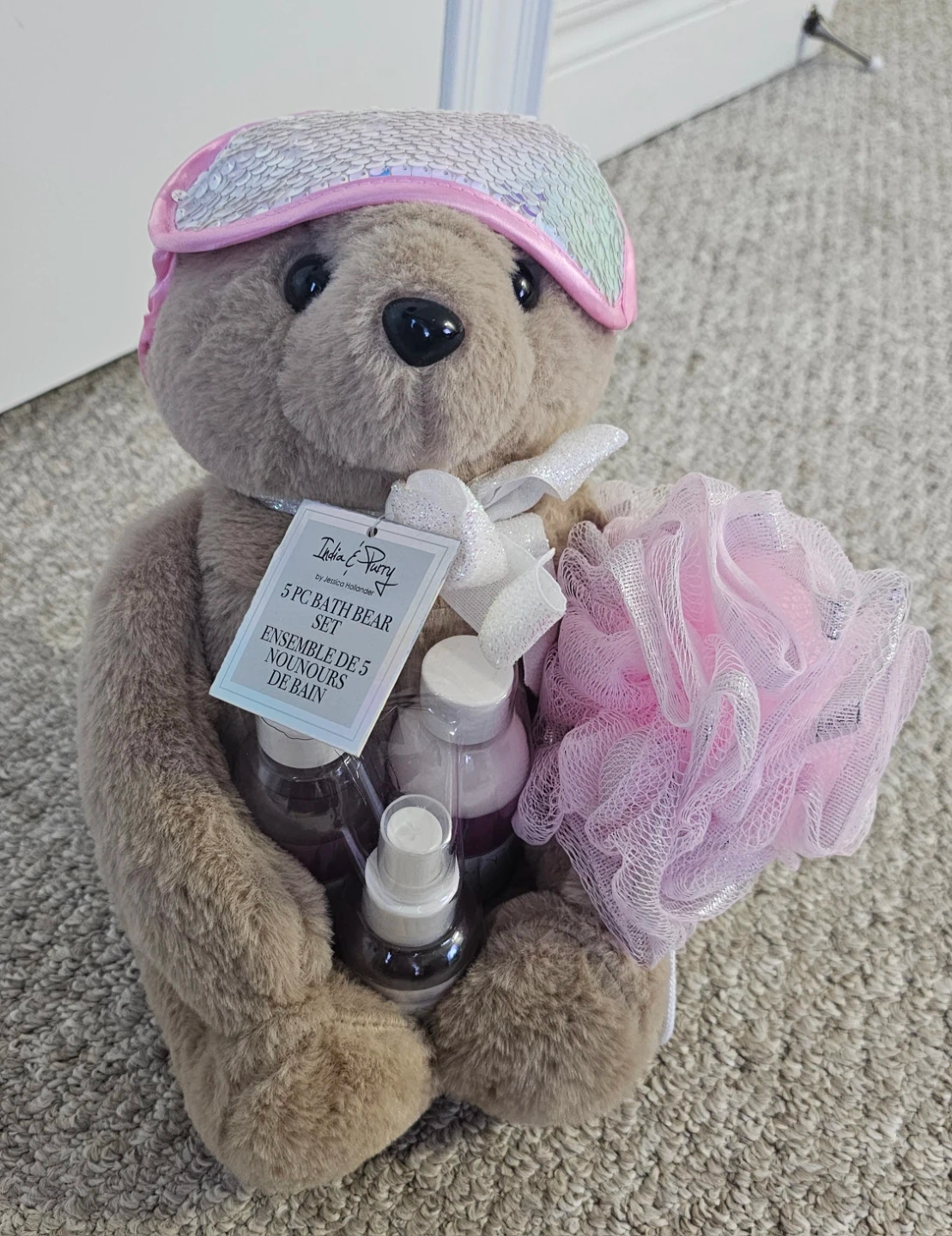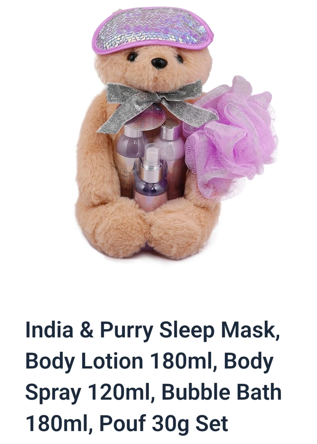 This India & Purry gift set includes a plush bear holding a sleep mask, body lotion 180ml, body spray 120ml, bubble bath 180ml, and a 30g pouf. It's a lovely way to relax and unwind!