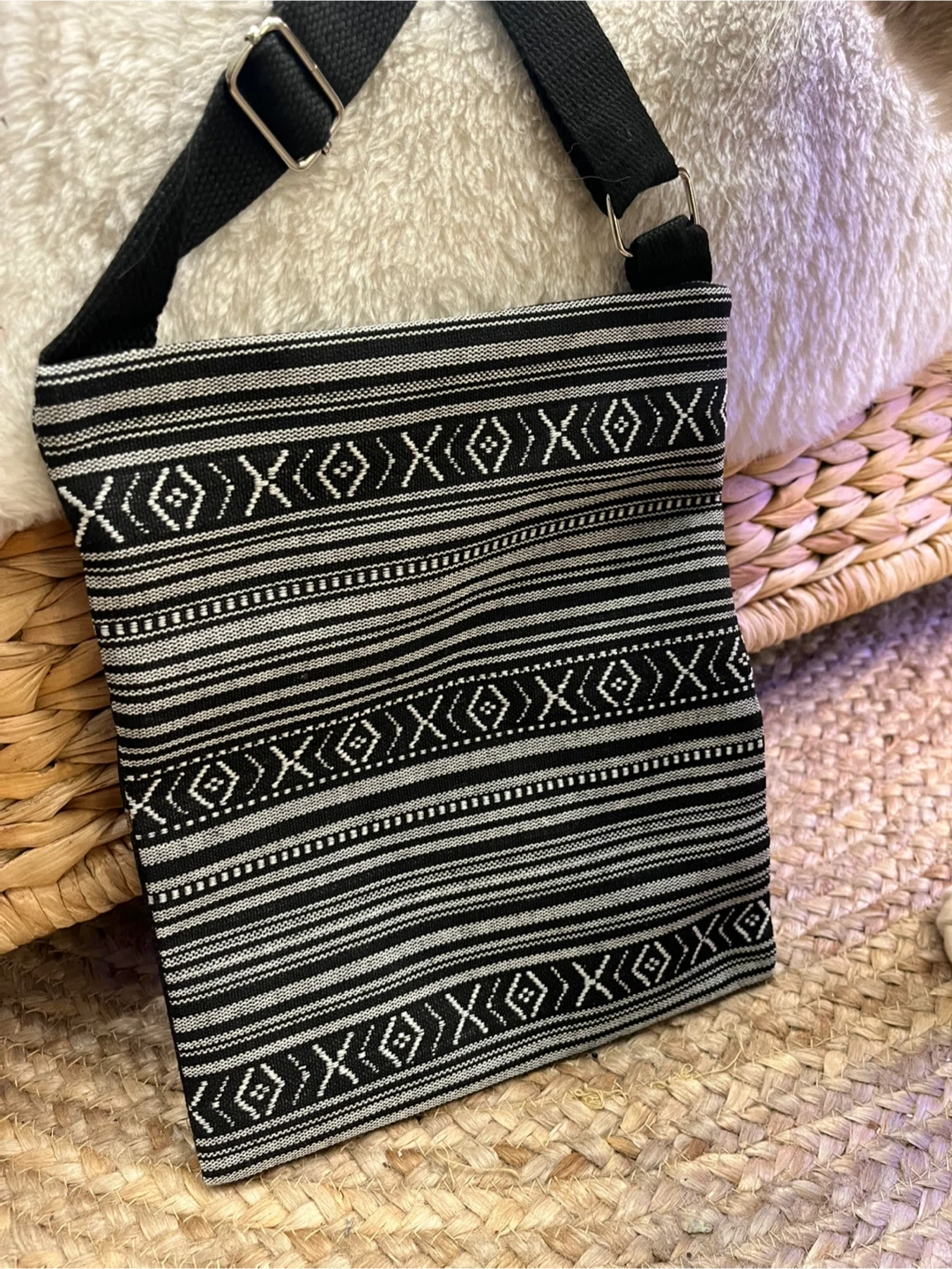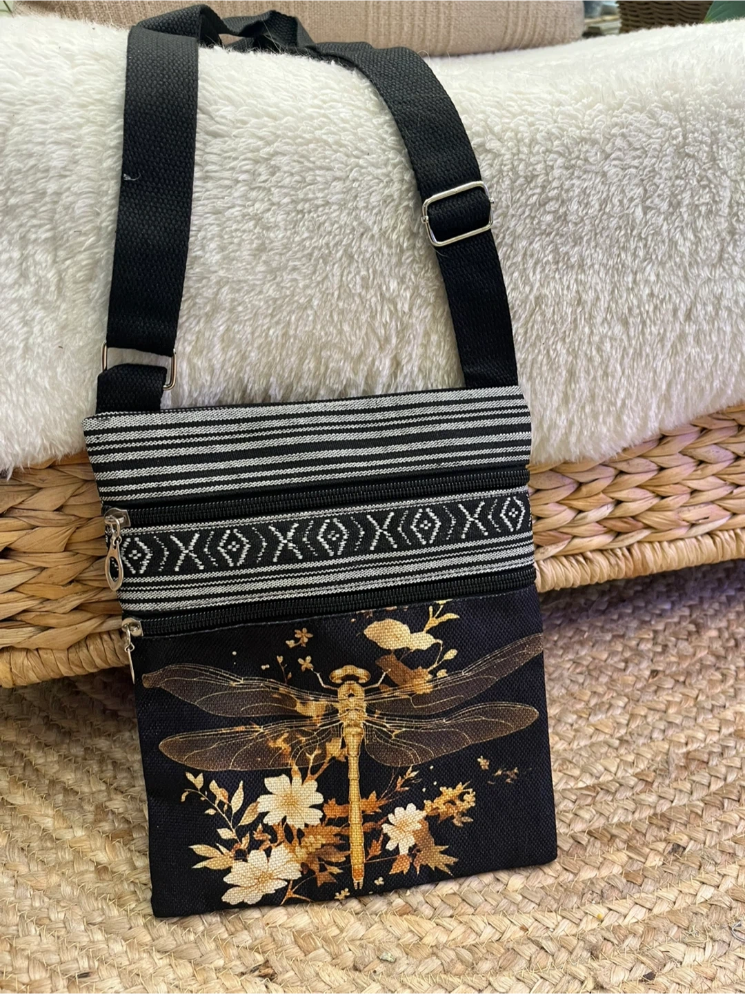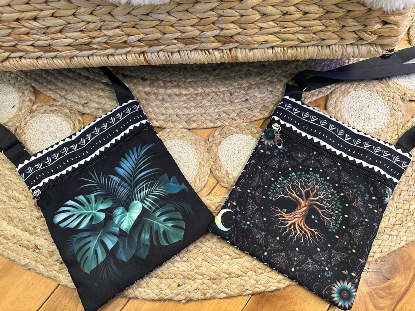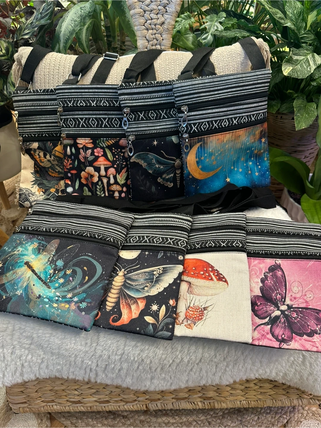 Cute collection of fabric crossbody handbags featuring unique, vibrant nature inspired graphic prints. Made with durable fabric and include double zipper closures for secure storage. Great for everyday use or travel!