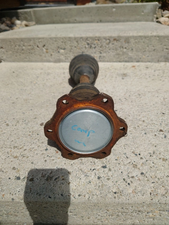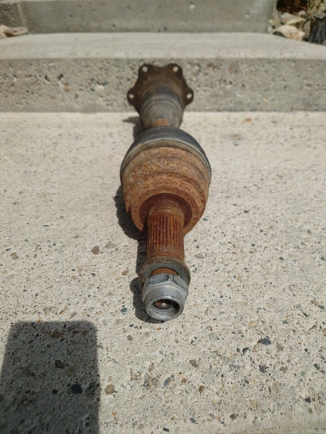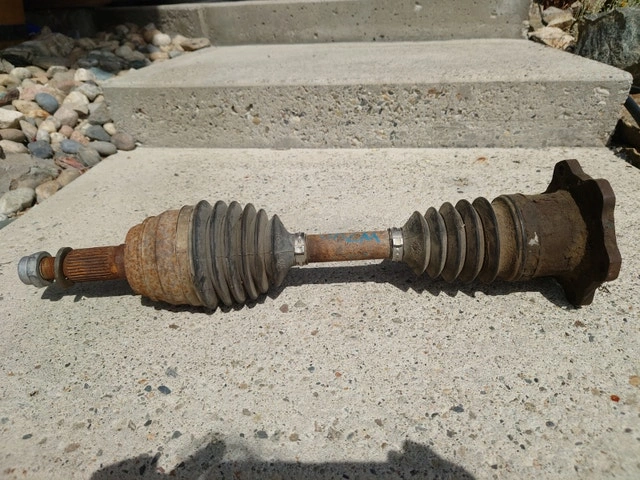 A used OEM CV axle shaft for any GM vehicle on the GMT800 platform (Yukon, Sierra, Tahoe, Silverado) from 1999 to 2006. It is interchangeable both on the left or right side of the vehicle. The axle is in excellent condition with no apparent damage and excessive wear. It has surface rust that is not affecting the integrity of the whole part. The rubber boots are intact, free of holes and tears. The threads and splines on the wheel mating end are undamaged. The bolt holes on the inner stub shaft mating end has no signs of elongation and cracks.