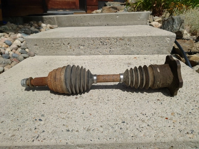 A used OEM CV axle shaft for any GM vehicle on the GMT800 platform (Yukon, Sierra, Tahoe, Silverado) from 1999 to 2006. It is interchangeable both on the left or right side of the vehicle. The axle is in excellent condition with no apparent damage and excessive wear. It has surface rust that is not affecting the integrity of the whole part. The rubber boots are intact, free of holes and tears. The threads and splines on the wheel mating end are undamaged. The bolt holes on the inner stub shaft mating end has no signs of elongation and cracks.