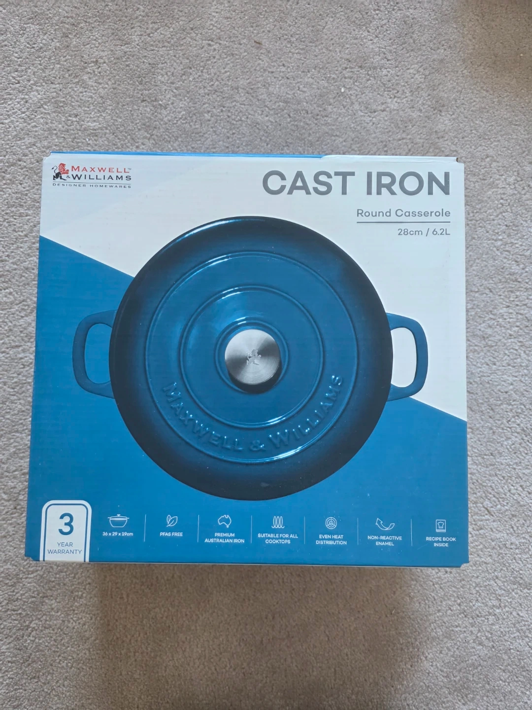 Maxwell & Williams 28cm cast iron round casserole. It's made with premium Australian iron and has a non-reactive enamel coating. Suitable for all cooktops with even heat distribution. Includes a recipe book inside!