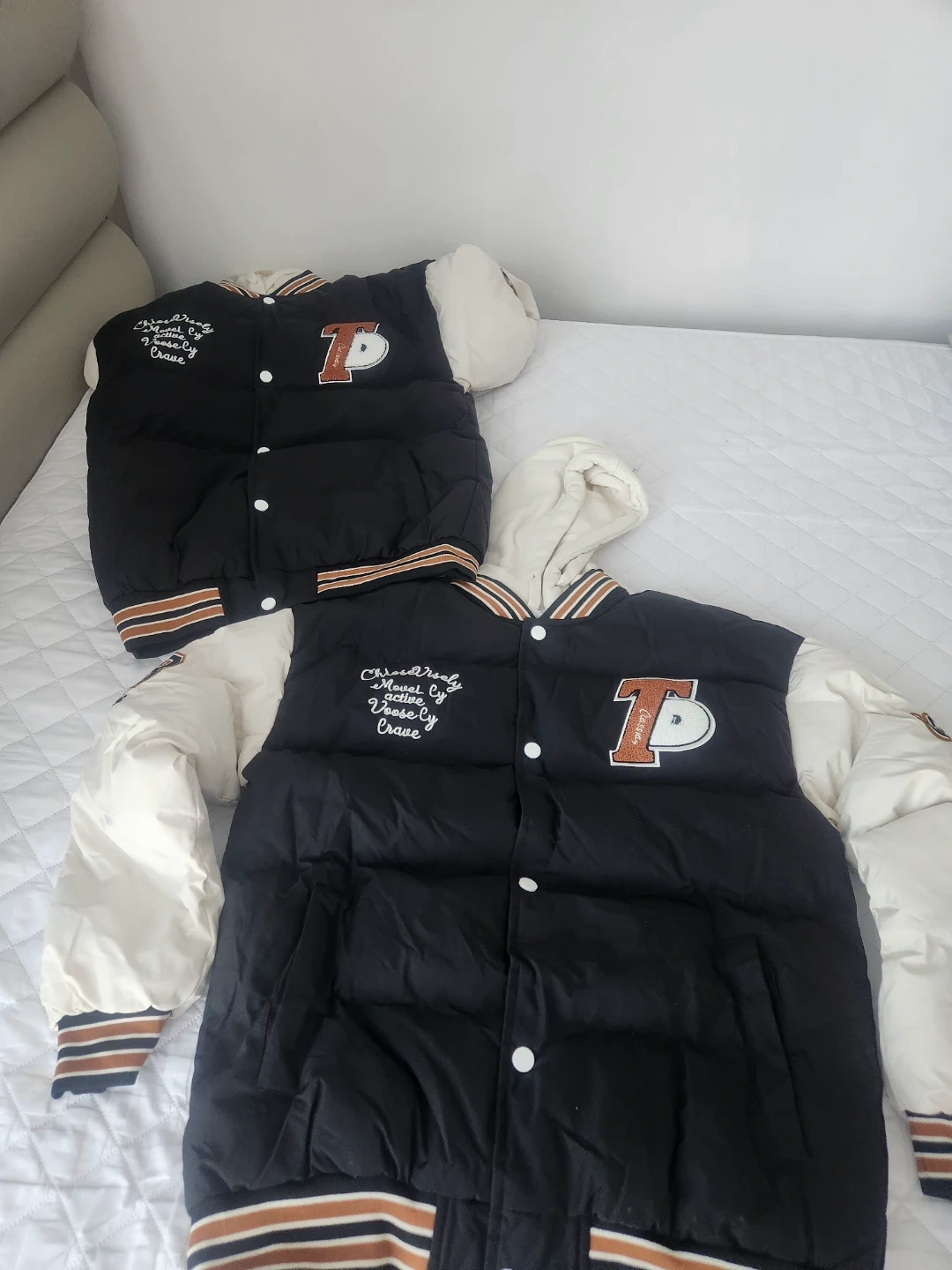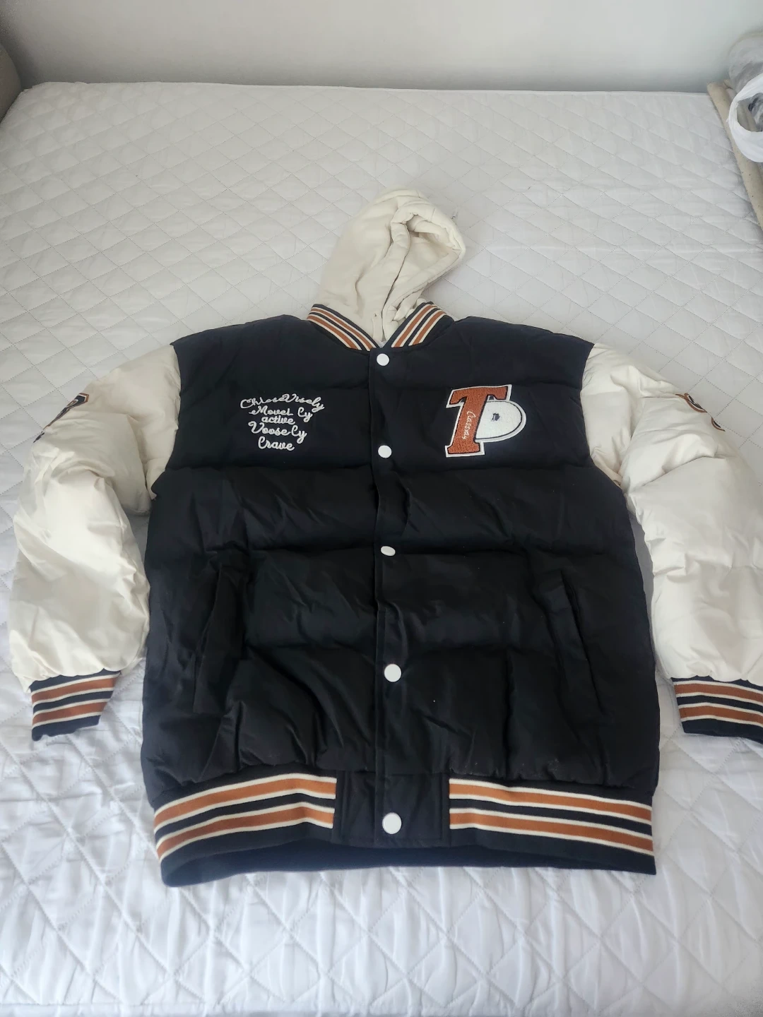 Varsity-style puffer bomber jacket with contrast sleeves and a removable hood. Features snap button closure and ribbed cuffs and hem.