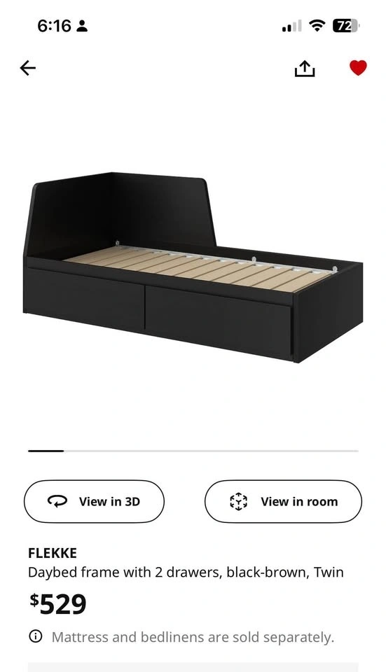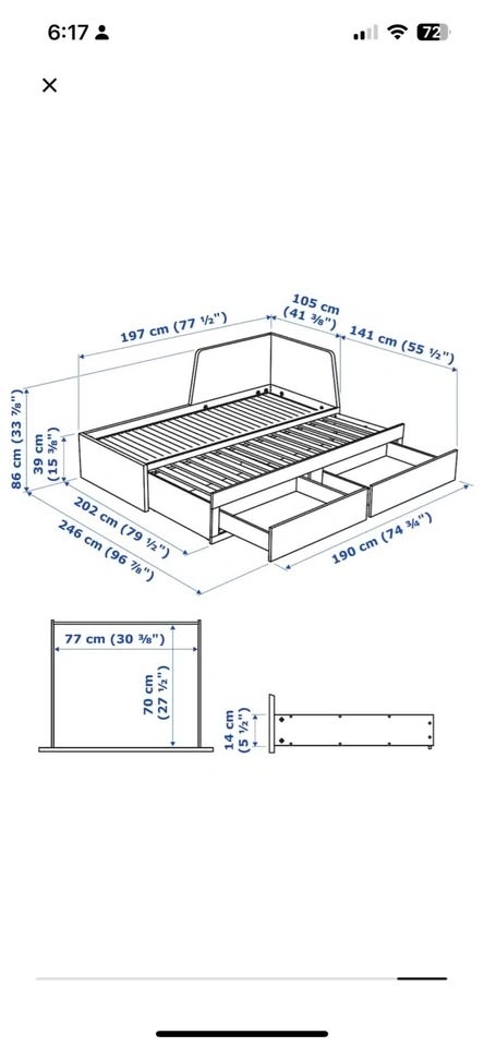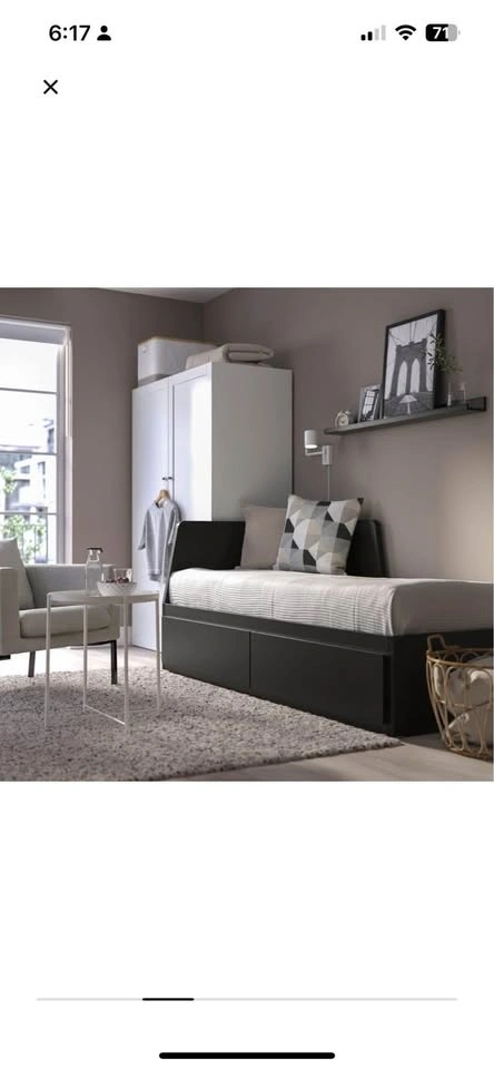 This is a comfortable and versatile Ikea daybed, perfect for a guest room or small living space. It can be used as a sofa during the day and easily converts into a bed at night. The frame is sturdy and the mattress is in good condition. Feel free to message if you have any questions!