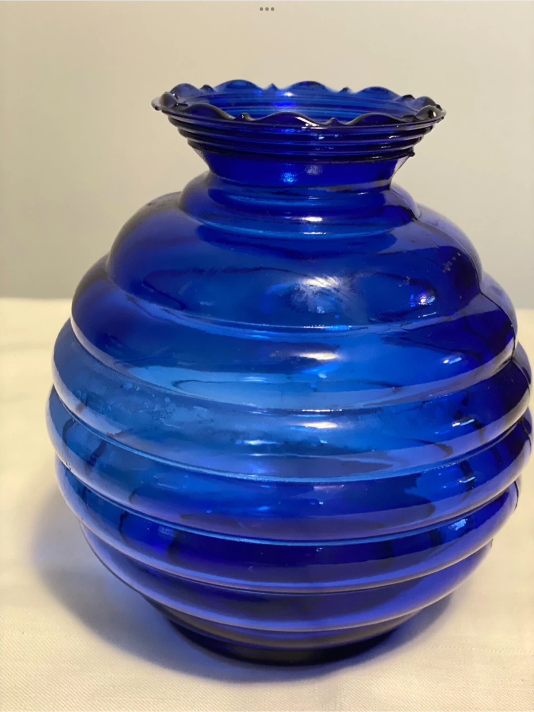 This beehive shaped vase is ribbed and has a scalloped edge. It is about 5 inches tall and 4 1/2 inches wide.
