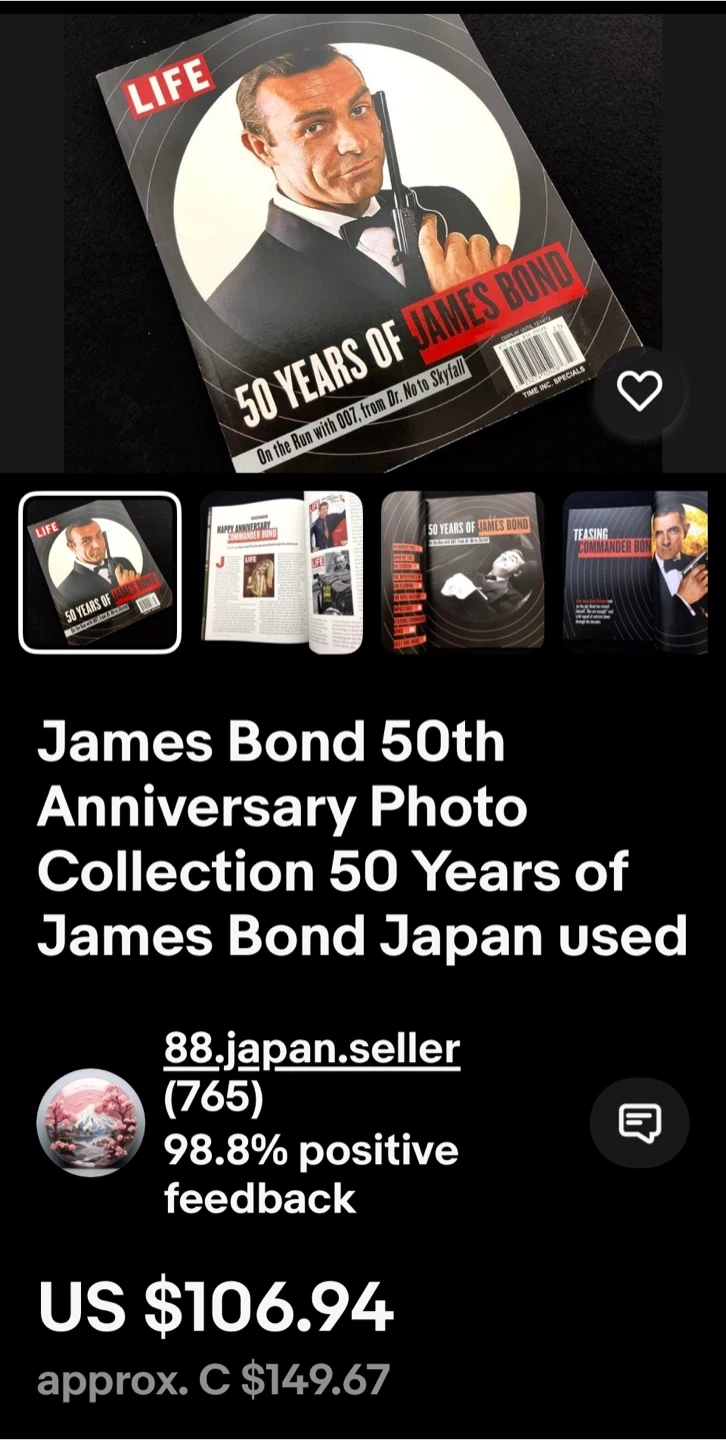 Buy & SellBond 50th Anniversary “Life” BooksBond 50th Anniversary “Life” Books$10-rare, must-have James Bond memorabilia for your collection! ***BOTH hard and soft editions for ONLY $10!***WHERE TO MEETCheck LocationView MapSELLERBillDemorestville200 reviews0 chats·0 favorites·6 viewsSEND CHAT TO SELLERHi Bill! I’m interested in your listing.Hi Bill! I’m interested in your listing.Get the Karrot app to chatSign In to chat