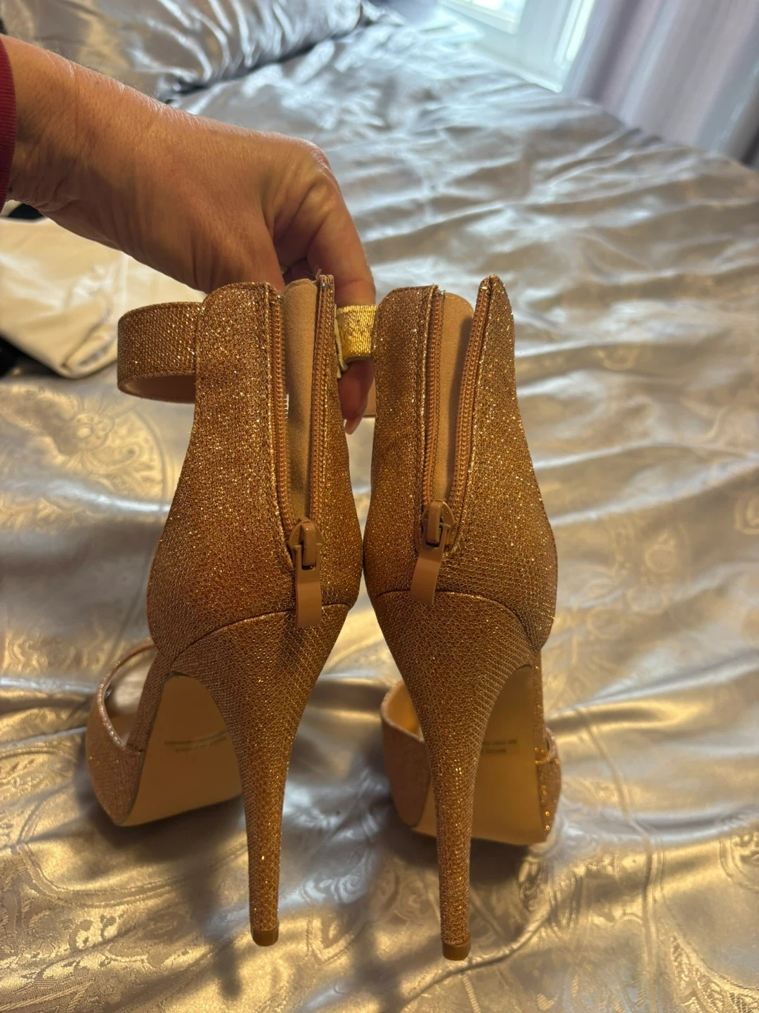 These stylish Dream Pairs heels are a beautiful rose gold colour with a glitter finish. They feature an ankle strap and peep-toe design. Size 8.