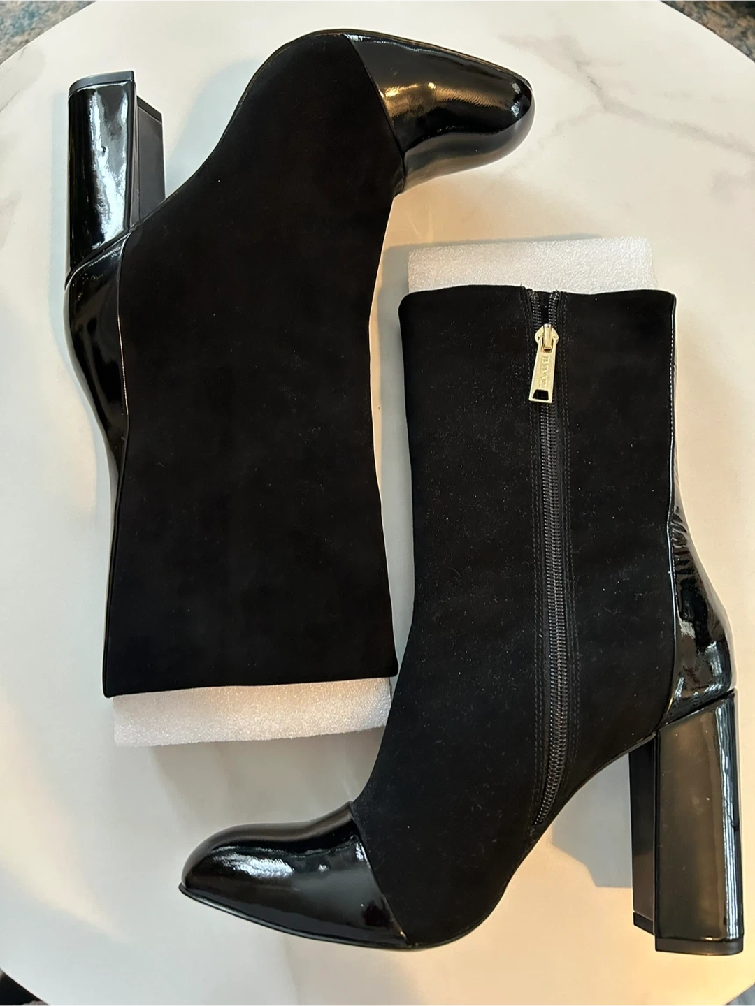 BRAND NEW! These Isaac Mizrahi 'Bella' boots are a stylish addition to any wardrobe! They feature a combination of black suede and patent leather, giving them a chic and modern look. The chunky heel adds a touch of elegance and provides comfortable support. They're perfect for dressing up or down!