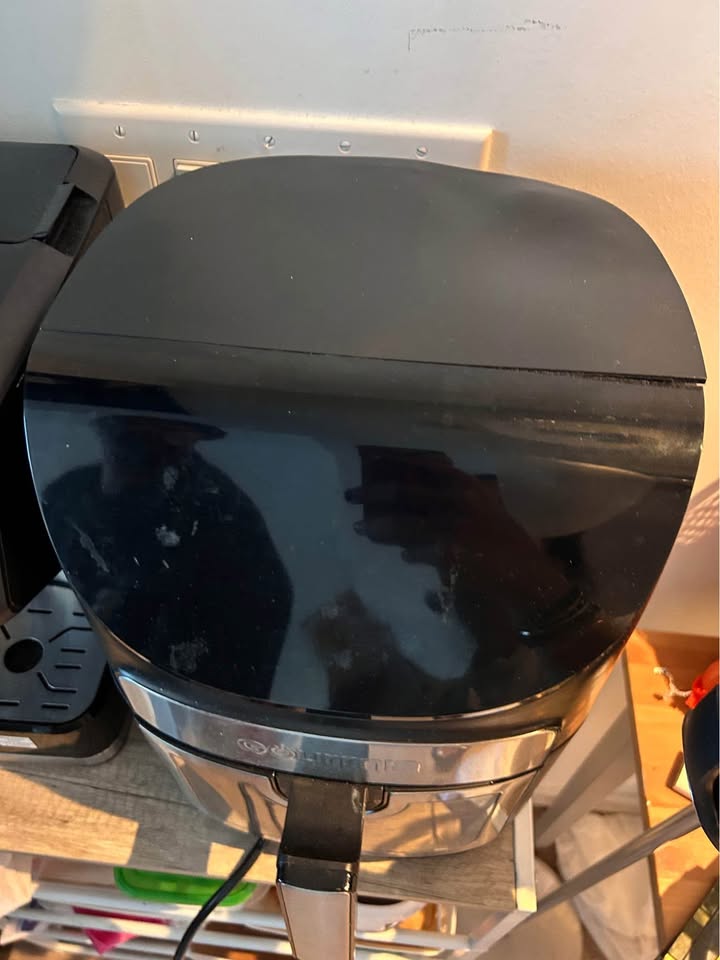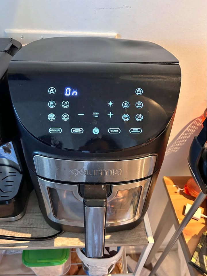 Selling a Gourmia air fryer in good condition. It's black and silver, and has a digital display with different cooking options. Great for making quick and easy meals!