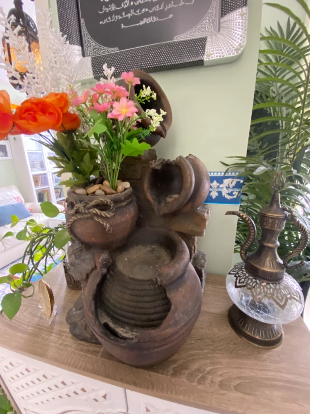 Beautiful garden water decoration available. It features flowing water, can be used indoors or outdoors, and is completely mess-free.