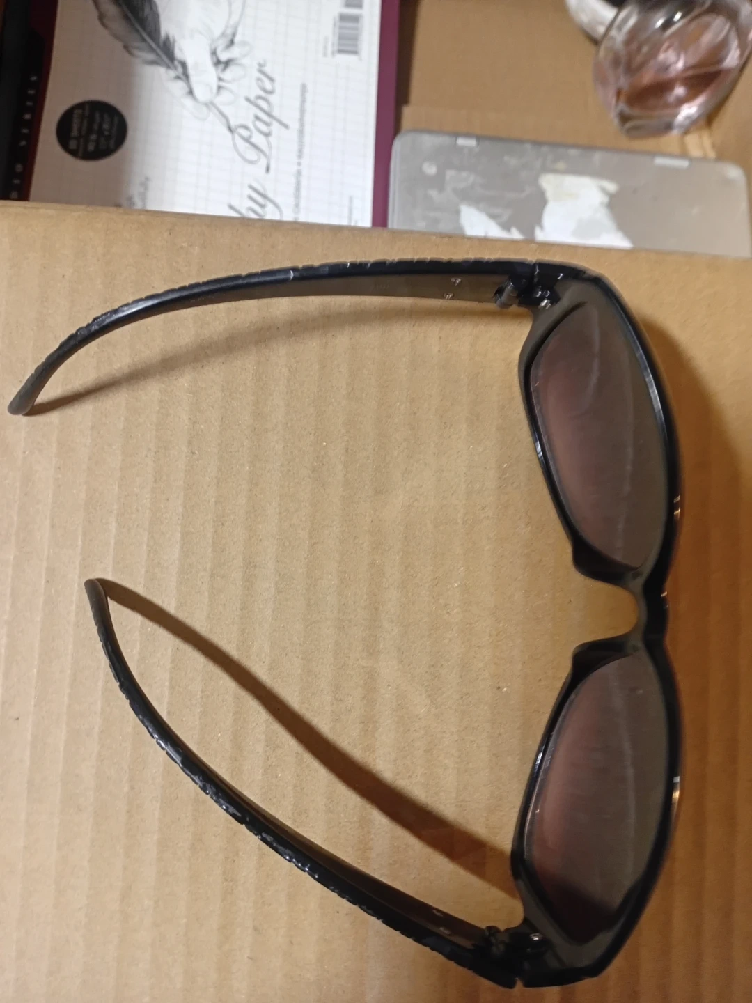 These stylish black oversized sunglasses feature a glossy finish and decorative gold-tone accents on the temples. They offer a comfortable fit with a fashionable look. Tinted lenses provide sun protection.