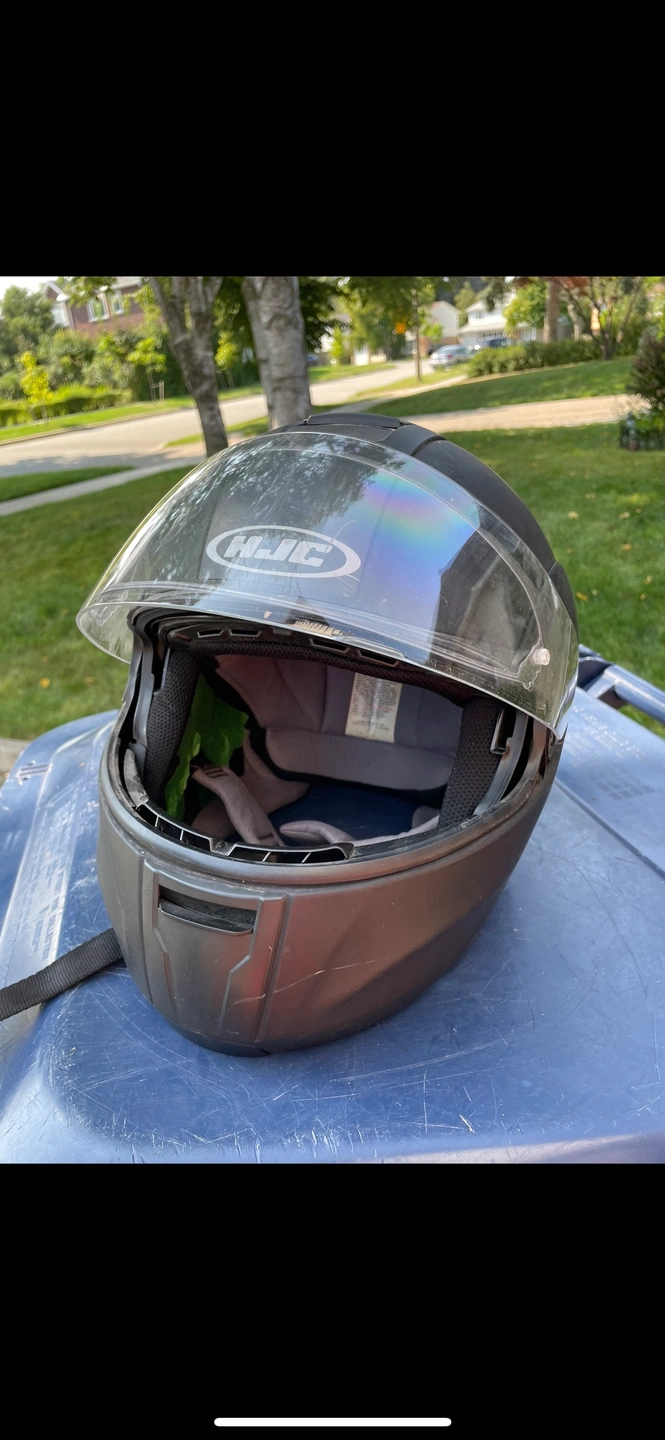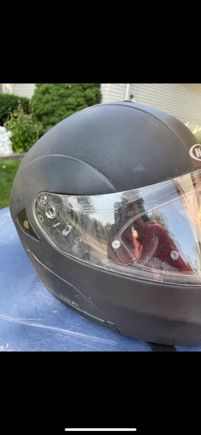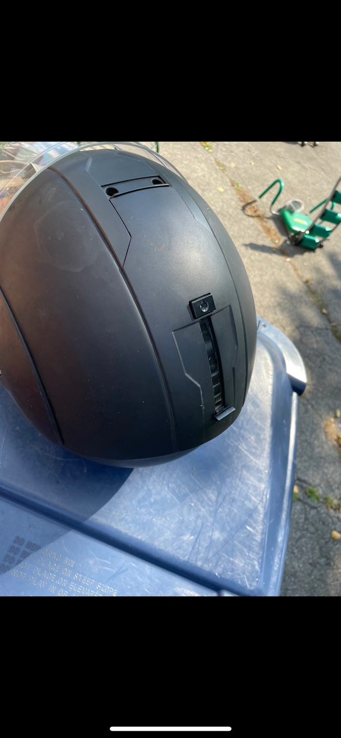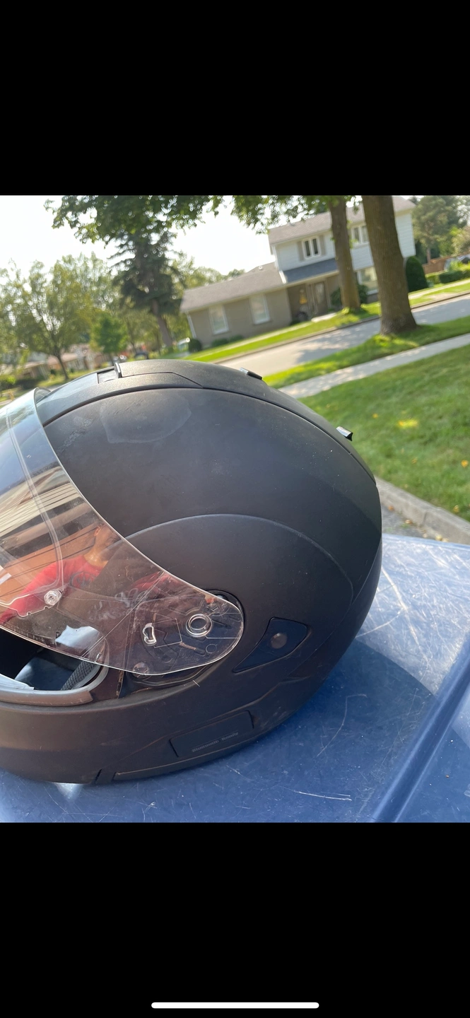 228Black motorcycle helmet with a clear shield. Includes chin strap. Medium. Also is blue tooth ready All sales are final.