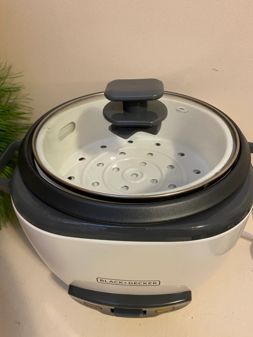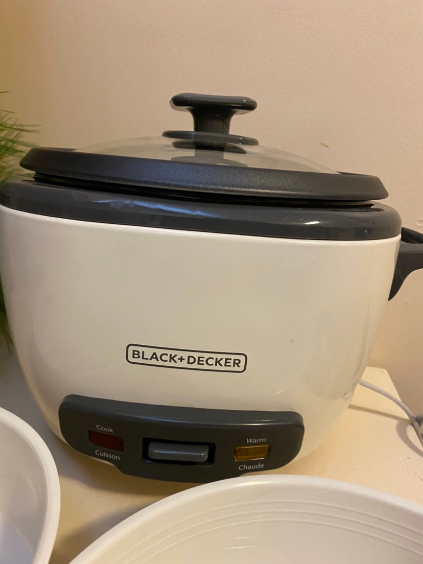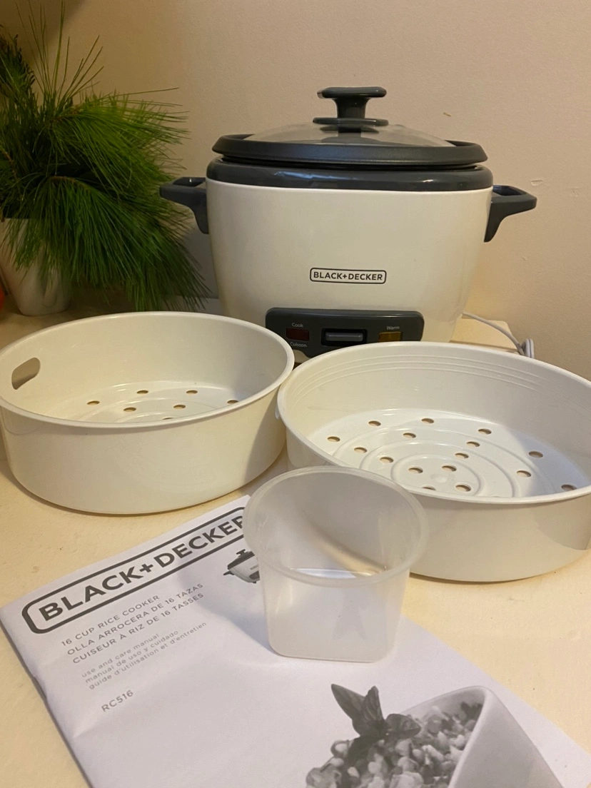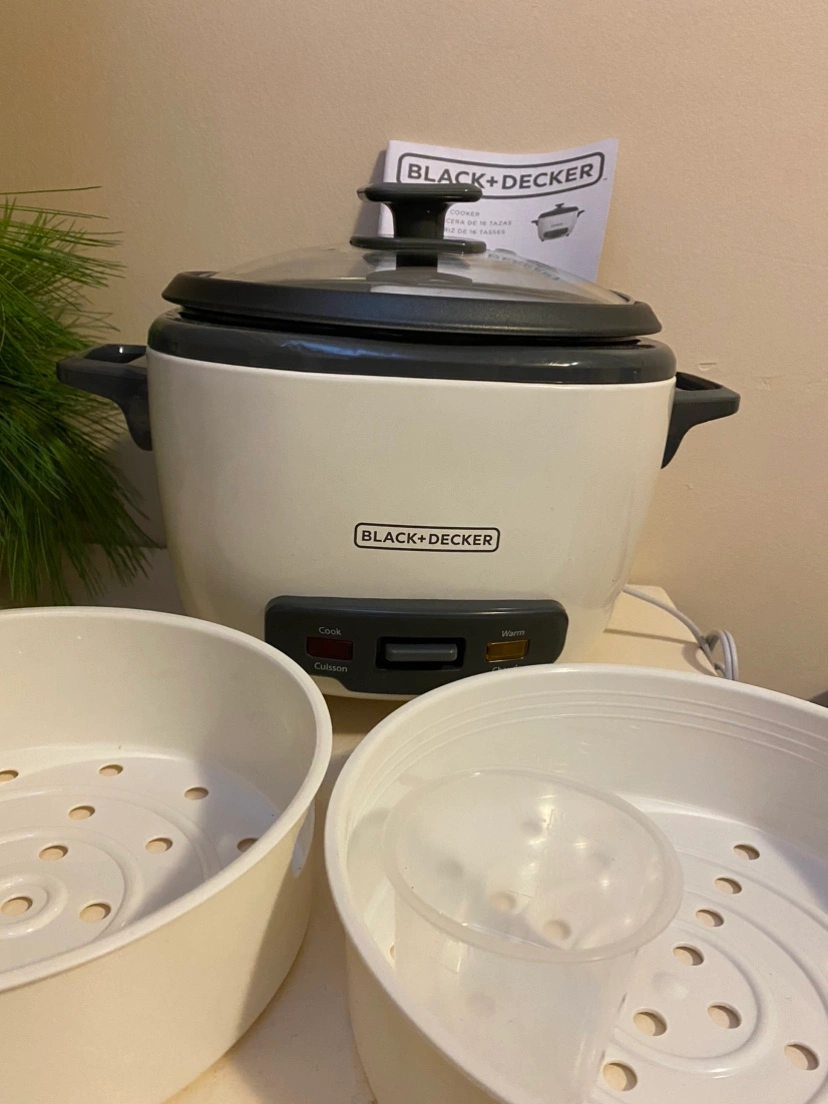 Black + Decker rice cooker. Includes two steamer bowls, a measuring cup, and instruction manual. Barely used. We have other rice cooker.