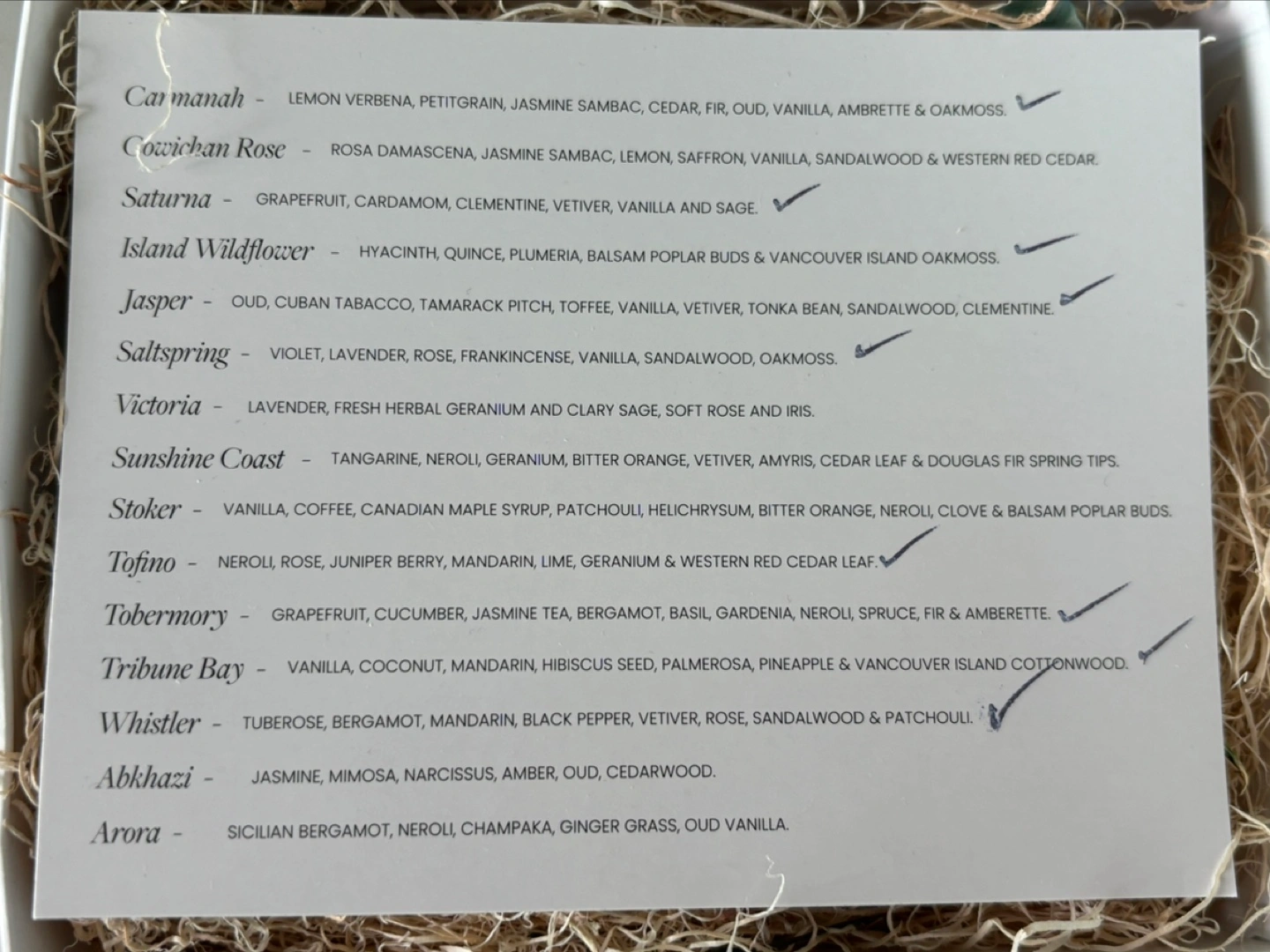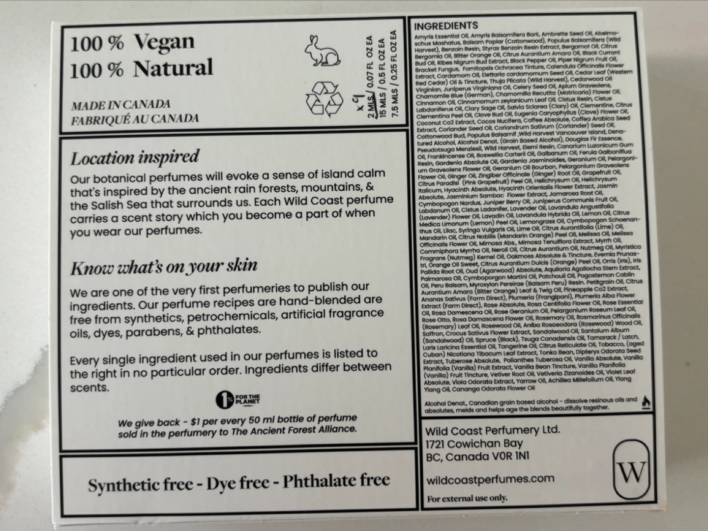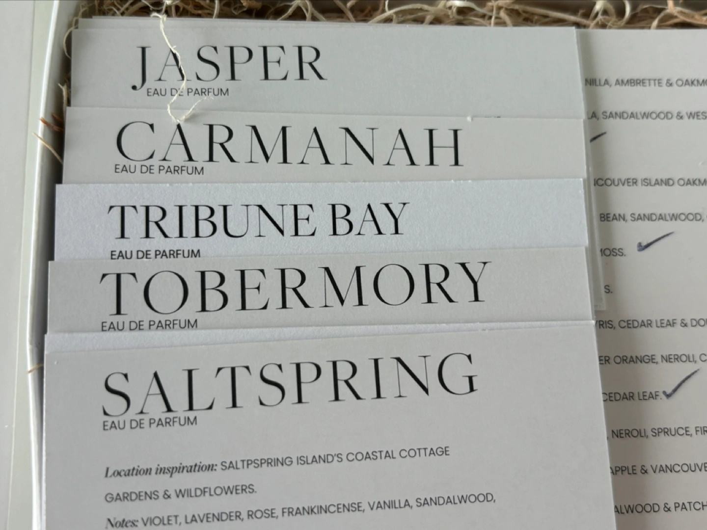 A set of nine 2 ml sample vials of Wild Coast Perfumery's Eau de Parfum. The scents included are Saltspring, Tobermory, Tribune Bay, Carmanah, and Jasper. 100% vegan Brand new and unused received as a gift