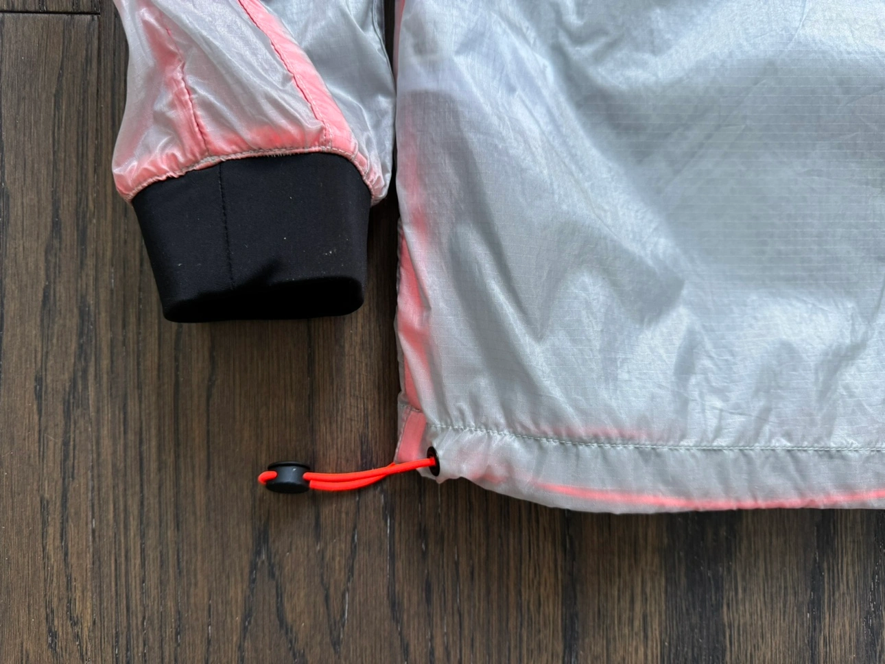 This pullover jacket is made of a ultra lightweight, transparent nylon riptop in light grey/silver-like color with a half-zip closure and a hood. It features neon orange and black accents and an Adidas logo on the front.