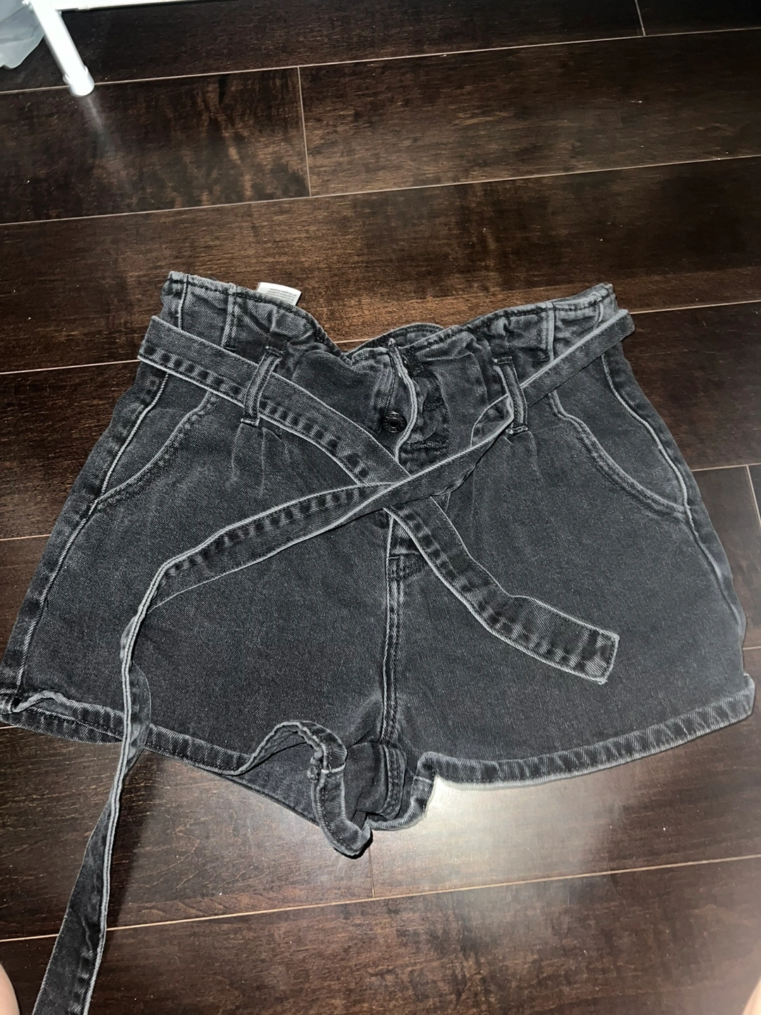 Black denim shorts with a belt. 2 front pockets and 2 back pockets. Size 2. (24-26inch) Pick up downtown!