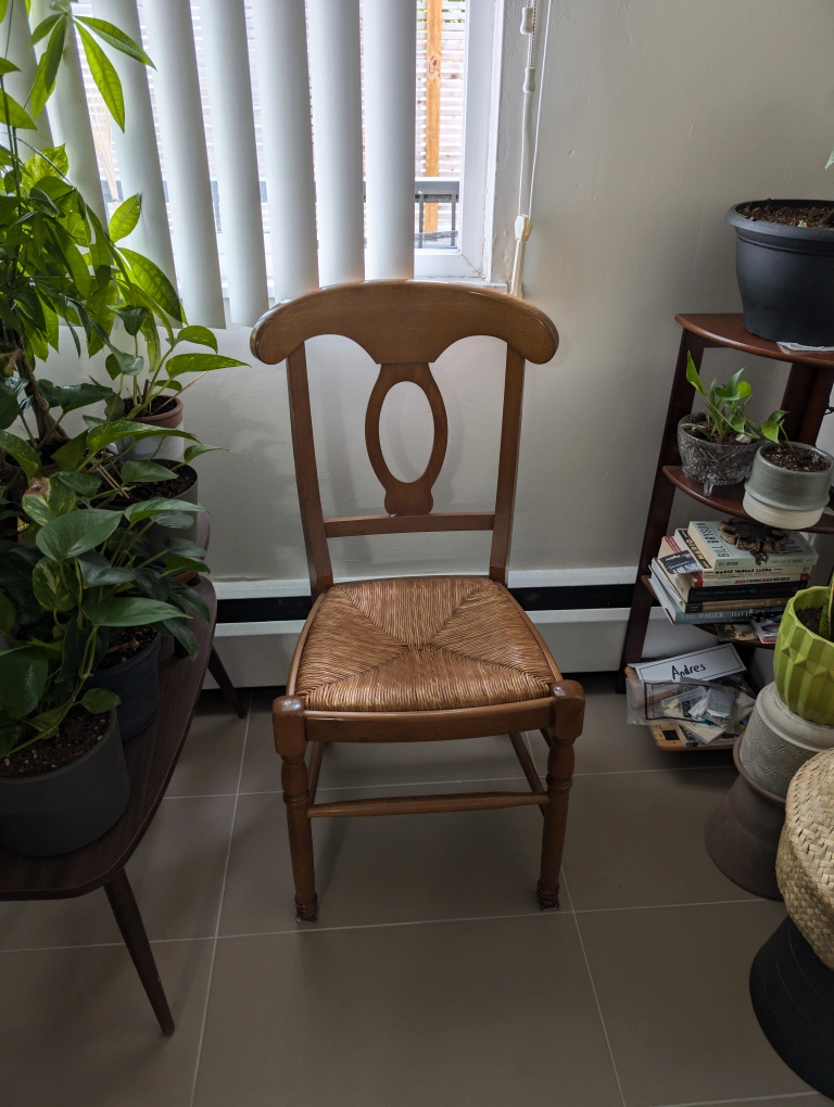 A simple wooden chair with a caned seat. It has a curved back and is a sturdy piece of furniture. The chair is ideal for a dining room or living room. It is in good condition