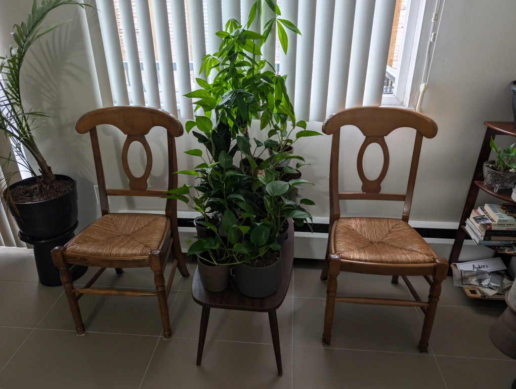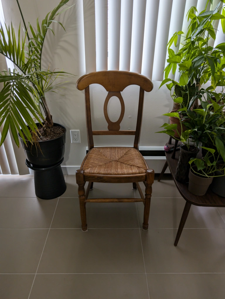 A simple wooden chair with a caned seat. It has a curved back and is a sturdy piece of furniture. The chair is ideal for a dining room or living room. It is in good condition