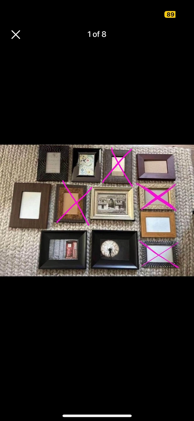 First photo, assorted 4” x 6” and 5” x 7” picture frames