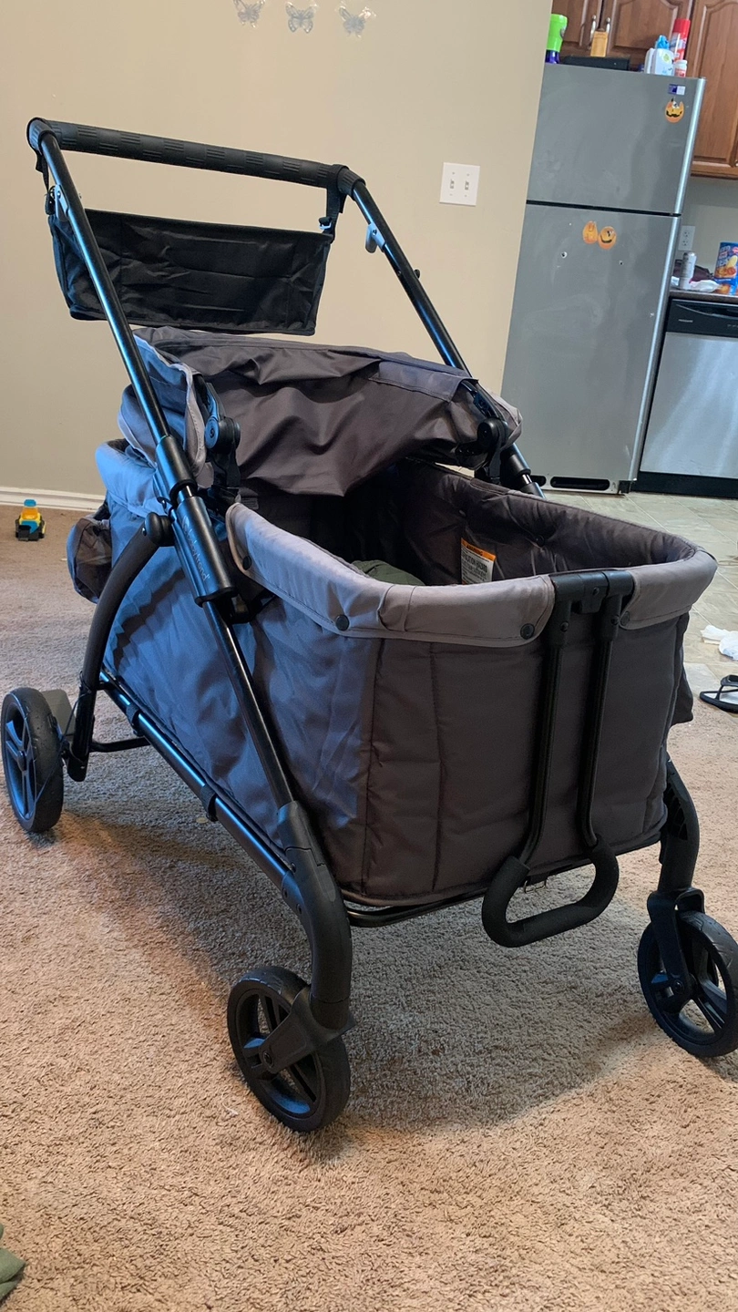 This stroller wagon is in great condition. It has a convenient storage basket and is perfect for taking your little one on walks or for errands. The wagon also folds down easily for storage.