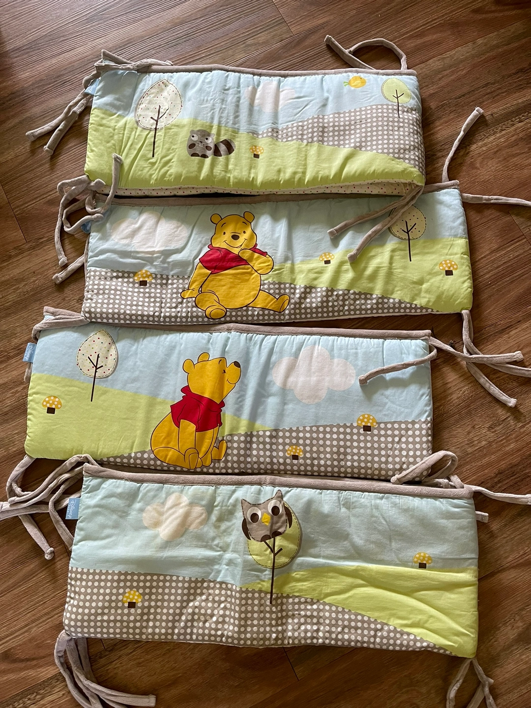 Four piece Winnie the Pooh crib bumper featuring Winnie the Pooh and a variety of other woodland characters.