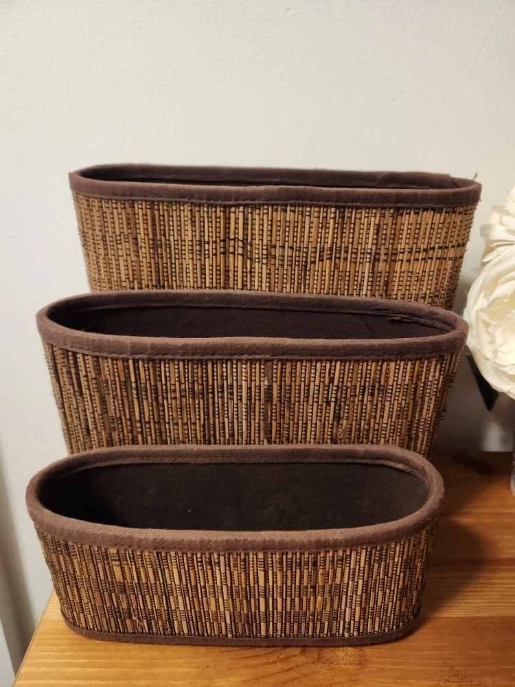Set of 3 oval bamboo baskets with brown fabric lining. Perfect for organizing bathroom essentials, craft supplies, or other small items.