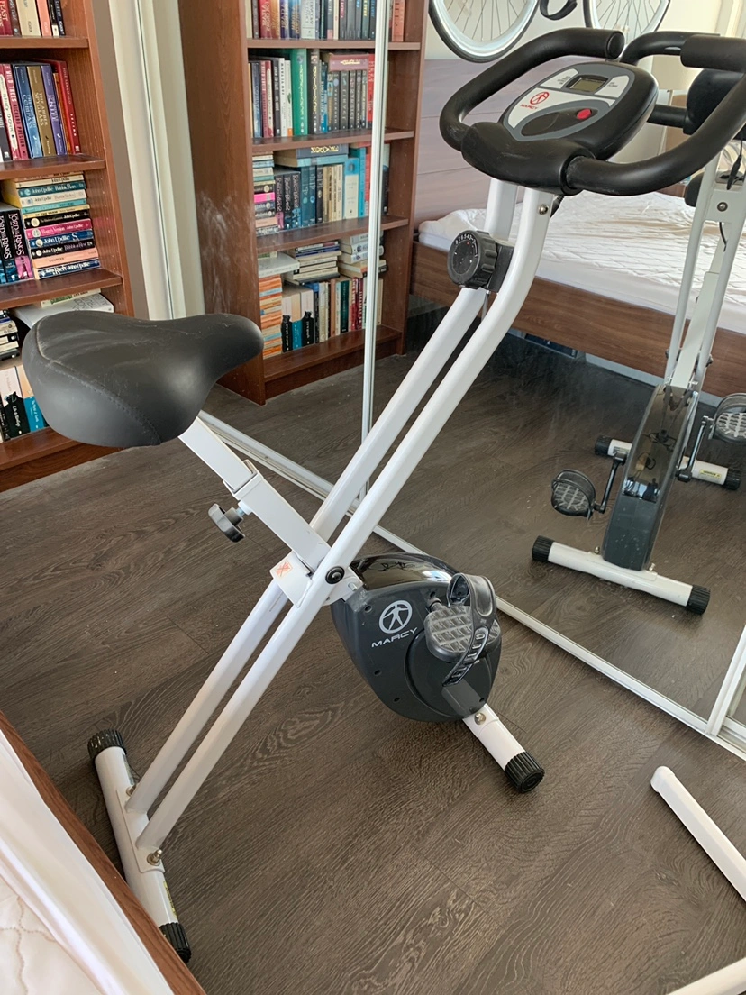 187This is a Marcy folding exercise bike. It comes with a digital display screen that shows time, speed, distance, and calories burned. The bike has adjustable resistance levels so you can tailor your workouts to your fitness level. It folds for easy storage.