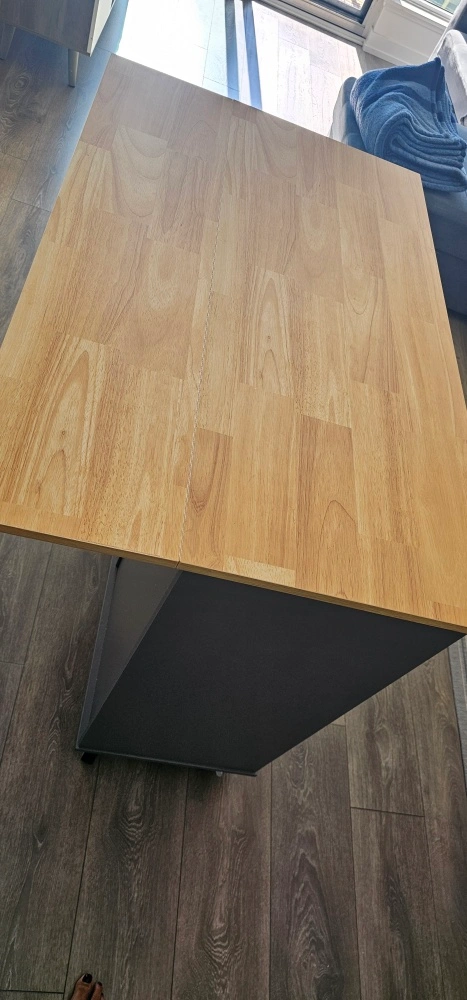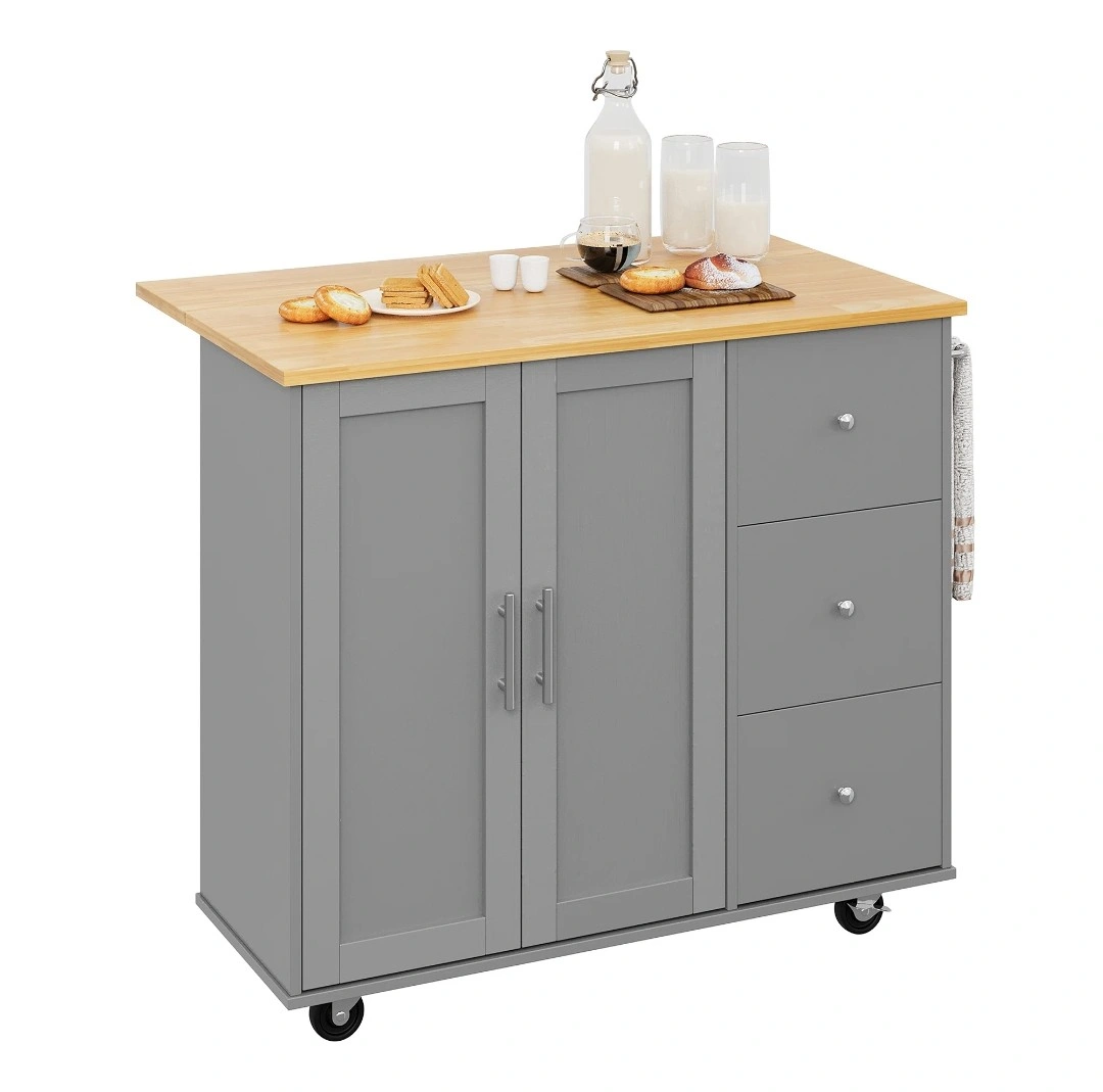 Grey and wood kitchen island with two doors, three drawers, and a butcher block countertop. This kitchen island features wheels so it is easy to move around. It has a towel rack on the side. It is perfect for small kitchens or for adding extra counter space.