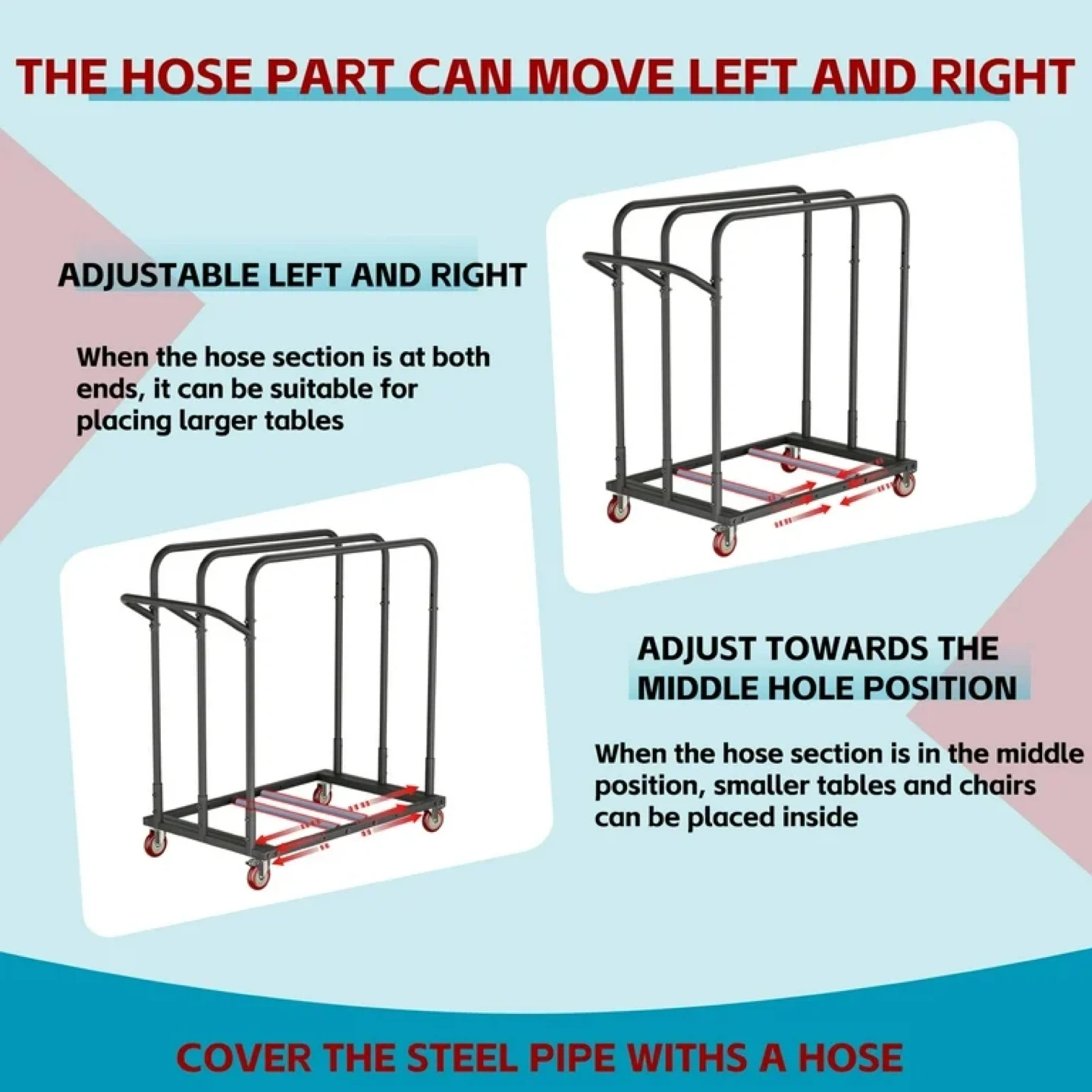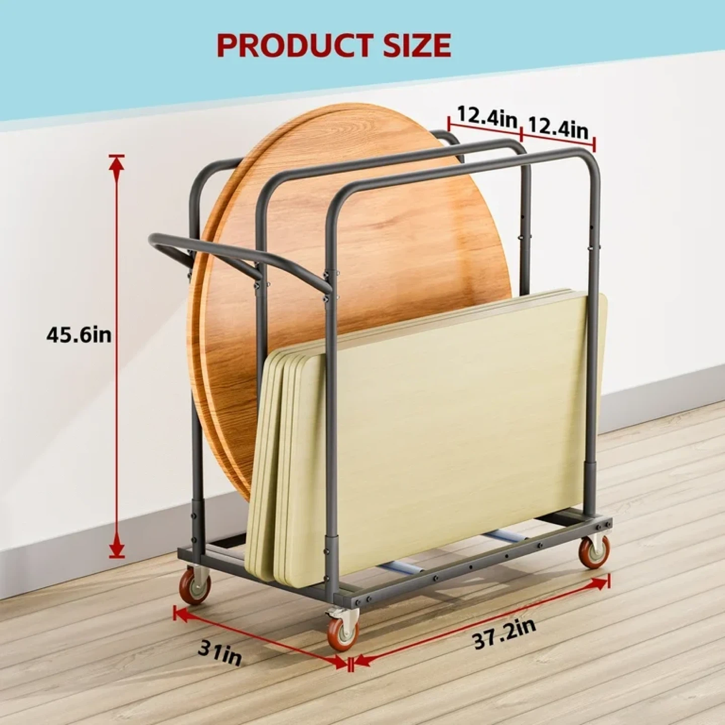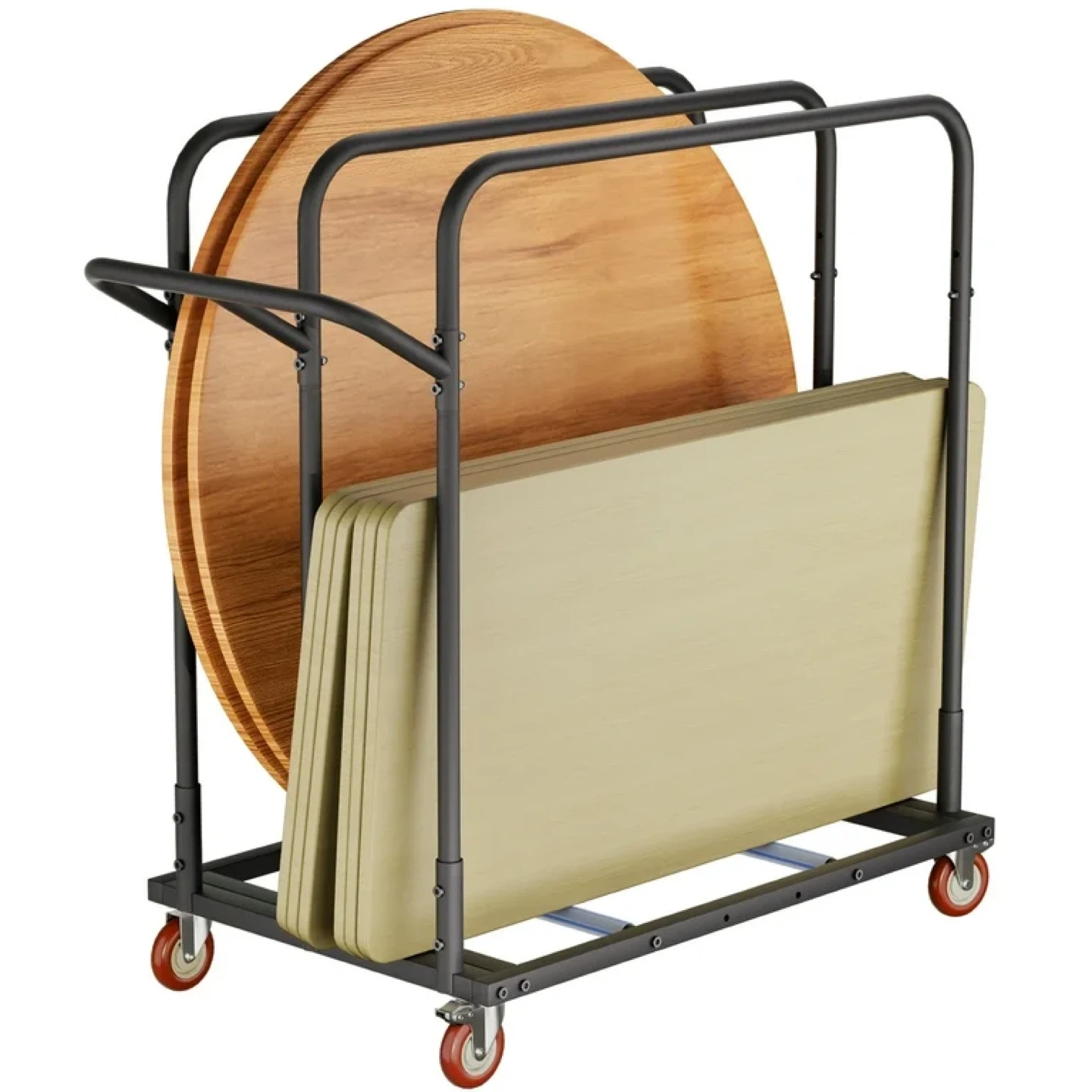 DUAL-FUNCTION TRANSPORT SYSTEM - Main platform securely carries tables while side hooks accommodate chairs simultaneously, enabling single-trip movement of complete dining sets.