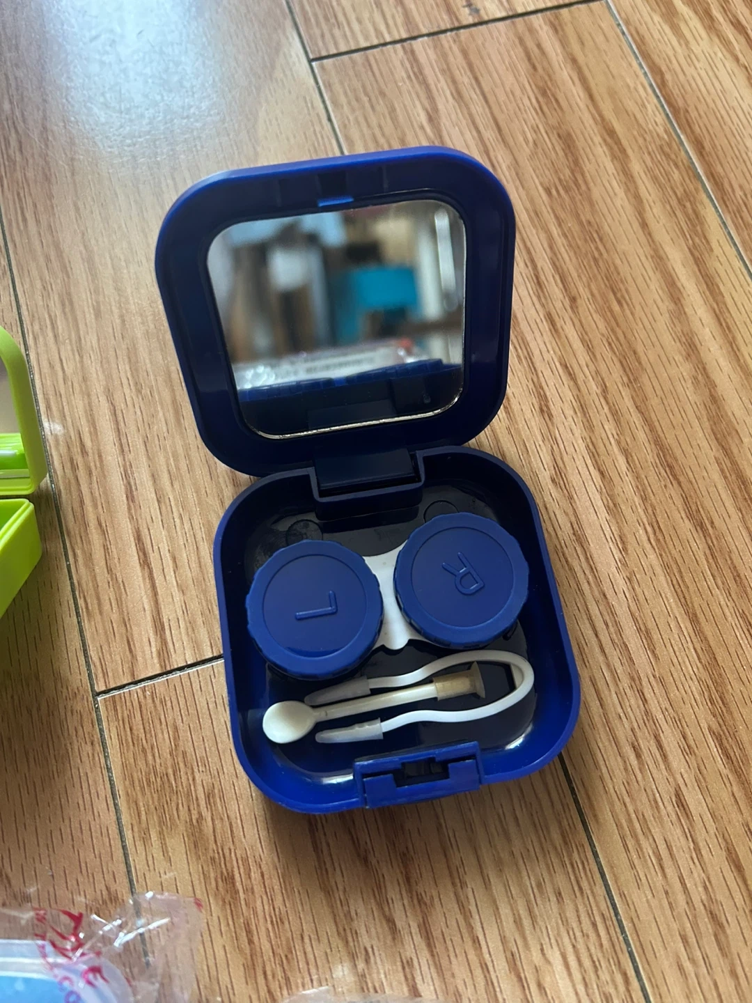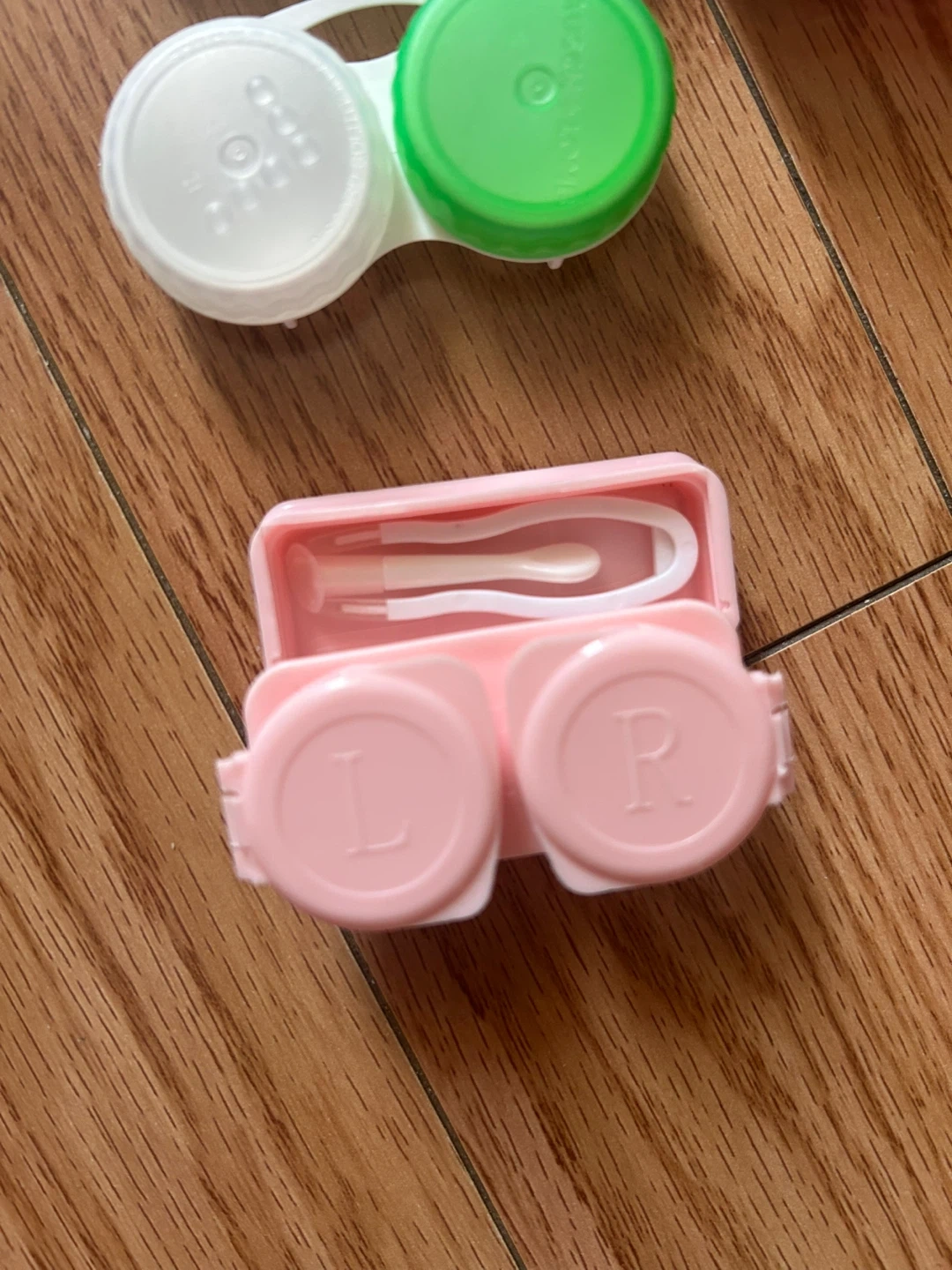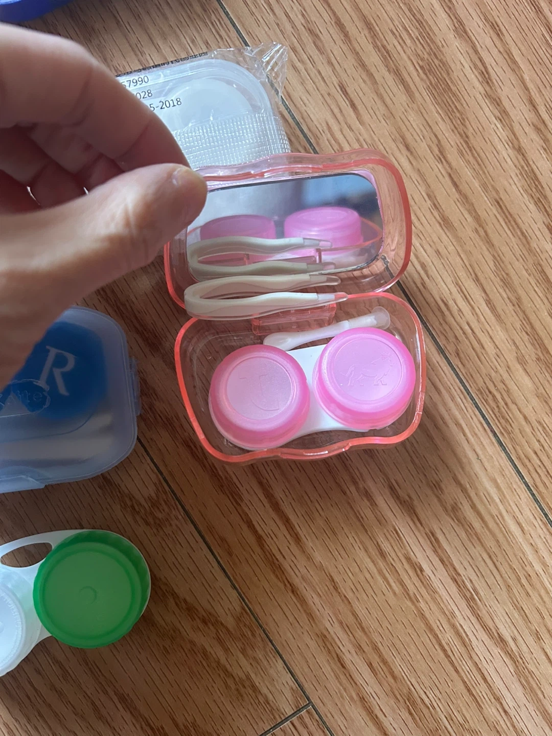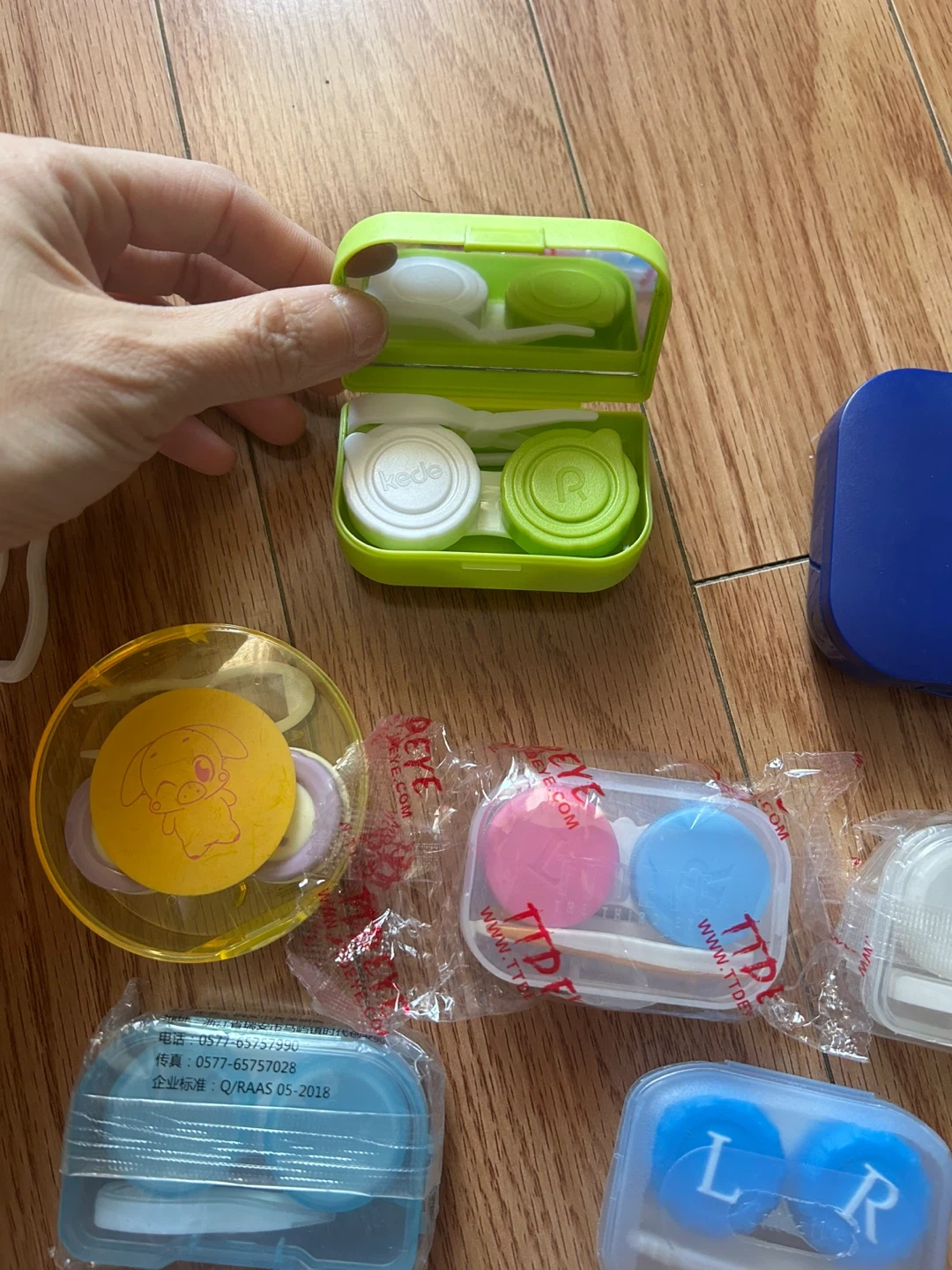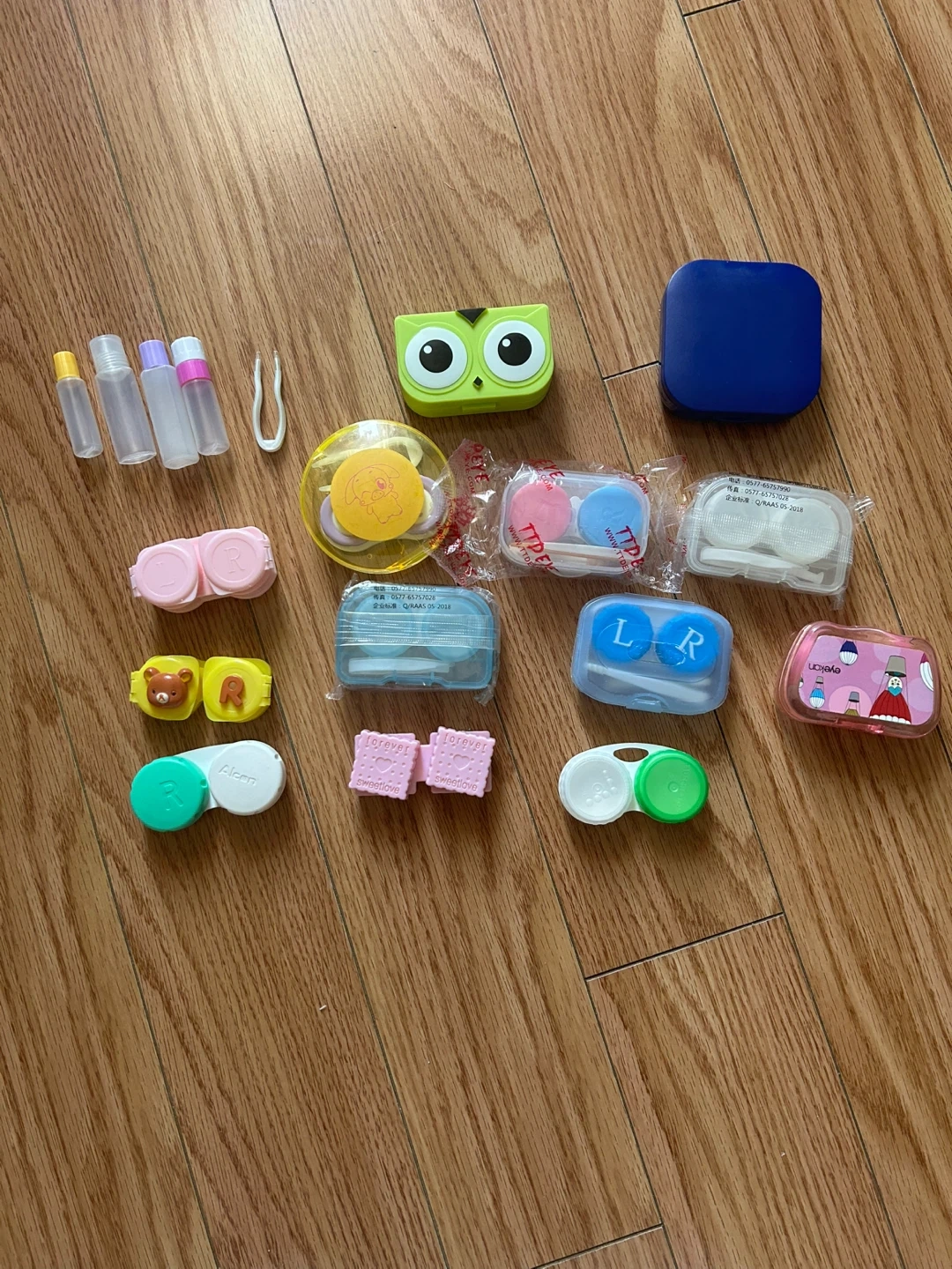Various contact lens cases and travel-sized solution bottles are included. These cases come in different colours and designs, some featuring animal shapes. Tweezers and small applicators are also part of the lot.