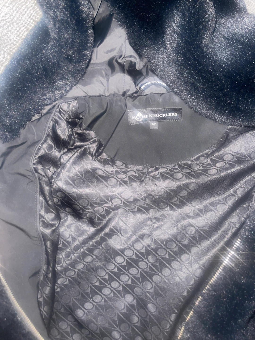 Black Moose Knuckles jacket with a faux fur hood and lining. It's a size S/P with a zippered front. The inner lining features a subtle logo pattern. Kids moose bunny girl price is negotiable sirious buyers only