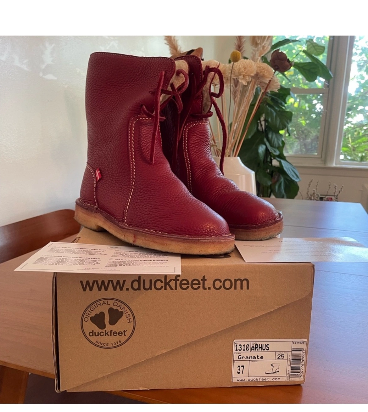 Red Duckfeet winter leather boots with laces. Comes with original box. Fits more like a size 6.5. I only worn them like three times.