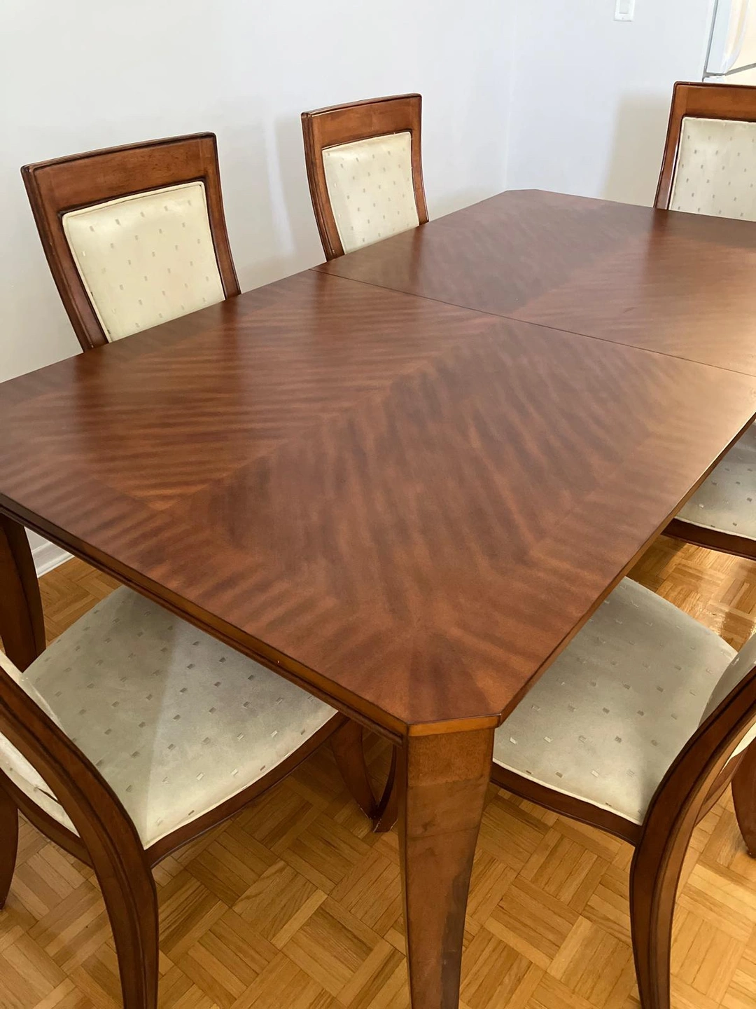 This dining table set includes a table and six chairs. The table is made of wood with a patterned top and the chairs are upholstered in a cream fabric. It is used but looks completely new. Price is also very negotiable. Located in North York.